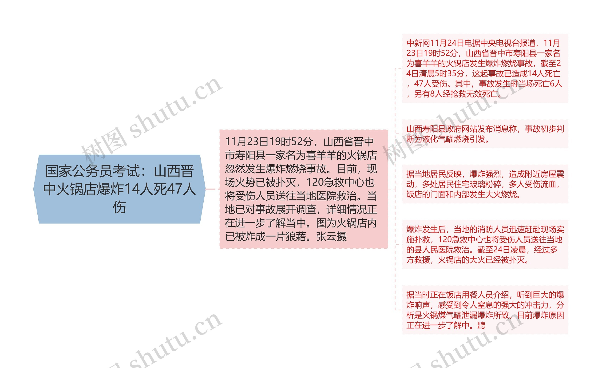 树图思维导图提供《国家公务员考试:山西晋中火锅店爆炸14人死47人伤》在线思维导图免费制作,点击“编辑”按钮,可对《国家公务员考试:山西晋中火锅店爆炸14人死47人伤》进行在线思维导图编辑,本思维导图属于思维导图模板主题,文件编号是:e74d2032d9acc9169db39848c45d3627