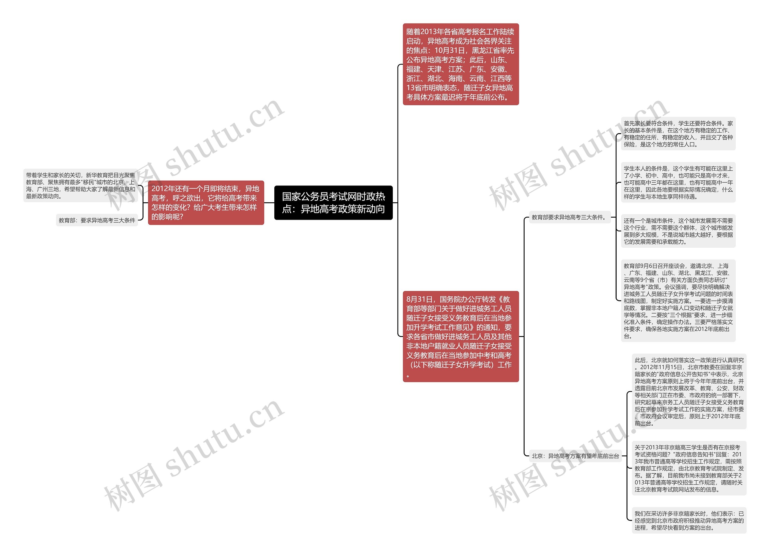 教育部9月6日召开座谈会,邀请北京、上海、广东、福建、山东、湖北、黑龙江、安徽、云南等9个省(市)有关方面负责同志研讨"异地高考"政策。会议强调,要尽快明确解决进城务工人员随迁子女升学考试问题的时间表和路线图,制定好实施方案。一要进一步摸清底数,掌握非本地户籍人口变动和随迁子女就学等情况。二要按"三个根据"要求,进一步细化准入条件,确定操作办法。三要严格落实文件要求,确保各地实施方案在2012年底前出台。