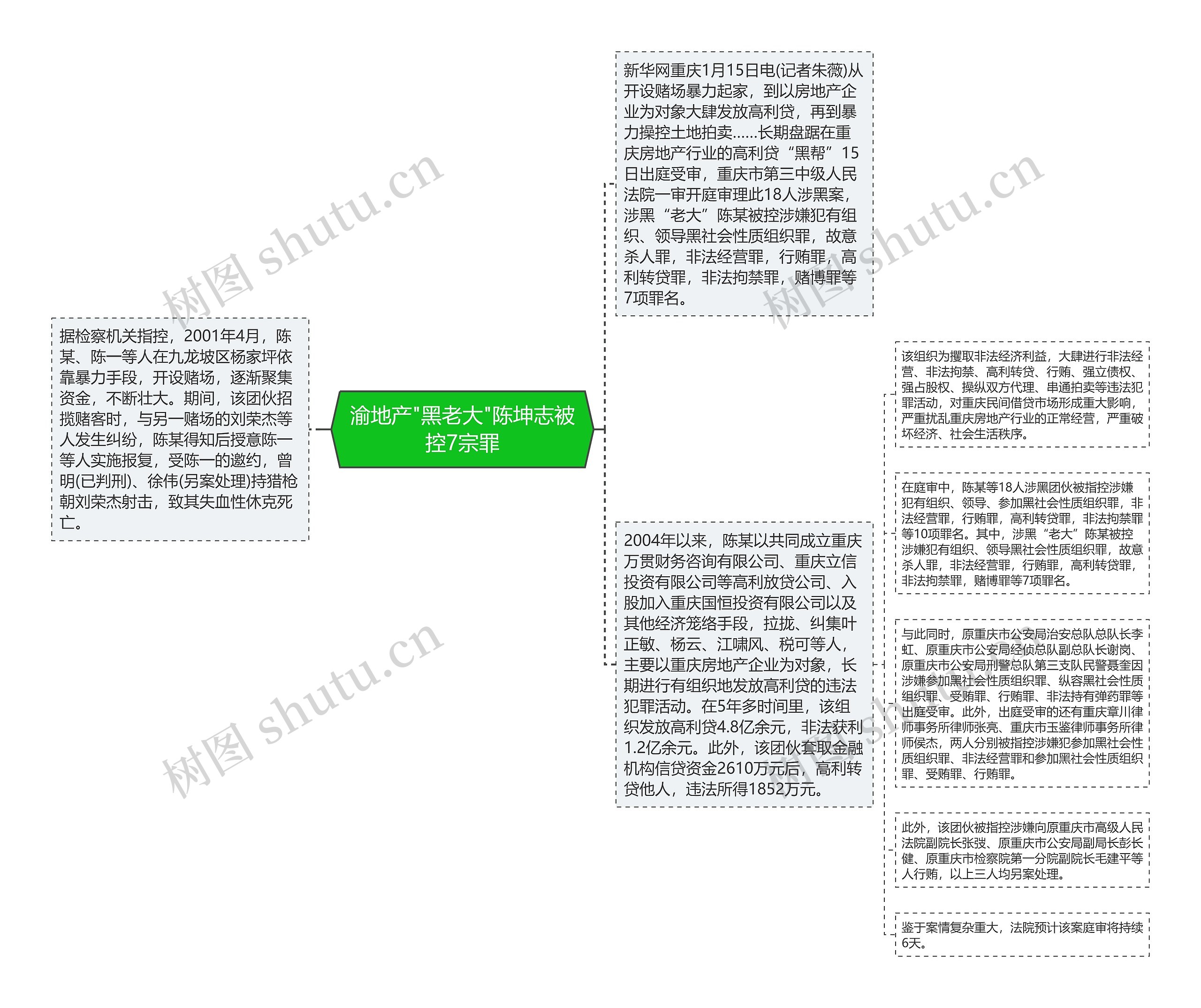 在庭审中,陈某等18人涉黑团伙被指控涉嫌犯有组织、领导、参加黑社会性质组织罪,非法经营罪,行贿罪,高利转贷罪,非法拘禁罪等10项罪名。其中,涉黑“老大”陈某被控涉嫌犯有组织、领导黑社会性质组织罪,故意杀人罪,非法经营罪,行贿罪,高利转贷罪,非法拘禁罪,赌博罪等7项罪名。
