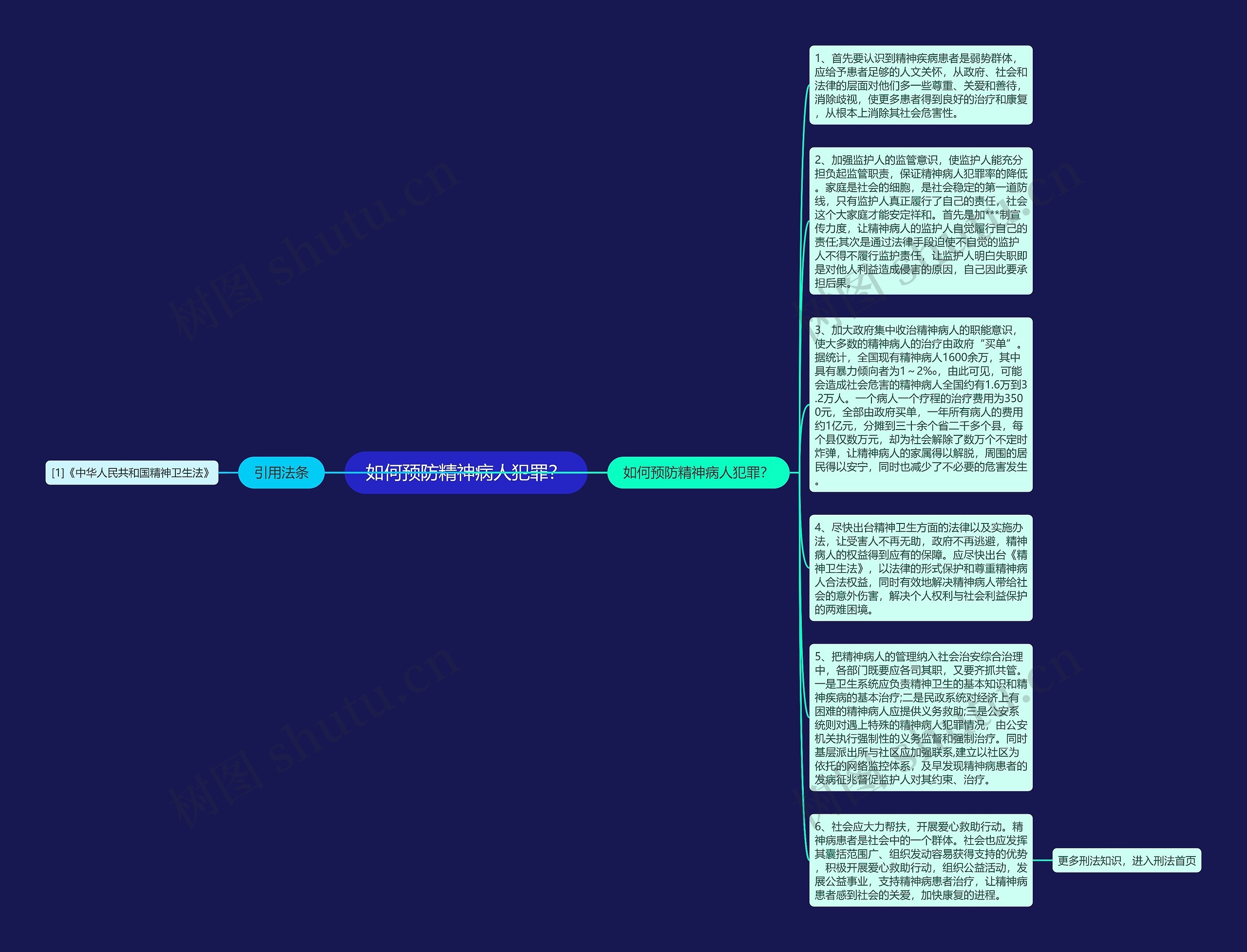 5、把精神病人的管理纳入社会治安综合治理中,各部门既要应各司其职,又要齐抓共管。一是卫生系统应负责精神卫生的基本知识和精神疾病的基本治疗;二是民政系统对经济上有困难的精神病人应提供义务救助;三是公安系统则对遇上特殊的精神病人犯罪情况,由公安机关执行强制性的义务监督和强制治疗。同时基层派出所与社区应加强联系,建立以社区为依托的网络监控体系,及早发现精神病患者的发病征兆督促监护人对其约束、治疗。