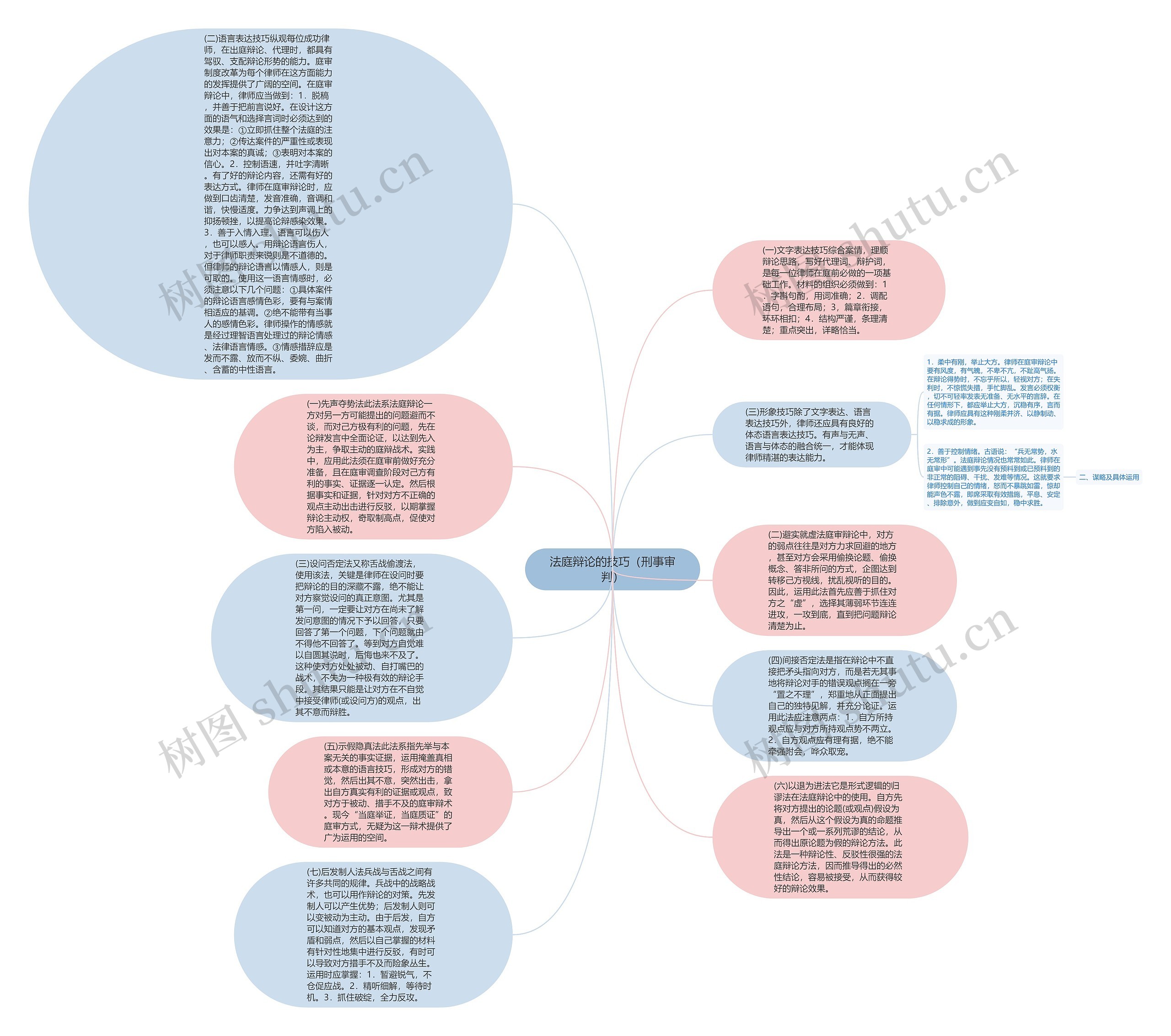 (二)语言表达技巧纵观每位成功律师,在出庭辩论、代理时,都具有驾驭、支配辩论形势的能力。庭审制度改革为每个律师在这方面能力的发挥提供了广阔的空间。在庭审辩论中,律师应当做到:1.脱稿,并善于把前言说好。在设计这方面的语气和选择言词时必须达到的效果是:①立即抓住整个法庭的注意力;②传达案件的严重性或表现出对本案的真诚;③表明对本案的信心。2.控制语速,并吐字清晰。有了好的辩论内容,还需有好的表达方式。律师在庭审辩论时,应做到口齿清楚,发音准确,音调和谐,快慢适度。力争达到声调上的抑扬顿挫,以提高论辩感染效果。3.善于入情入理。语言可以伤人,也可以感人。用辩论语言伤人,对于律师职责来说则是不道德的。但律师的辩论语言以情感人,则是可取的。使用这一语言情感时,必须注意以下几个问题:①具体案件的辩论语言感情色彩,要有与案情相适应的基调。②绝不能带有当事人的感情色彩。律师操作的情感就是经过理智语言处理过的辩论情感、法律语言情感。③情感措辞应是发而不露、放而不纵、委婉、曲折、含蓄的中性语言。