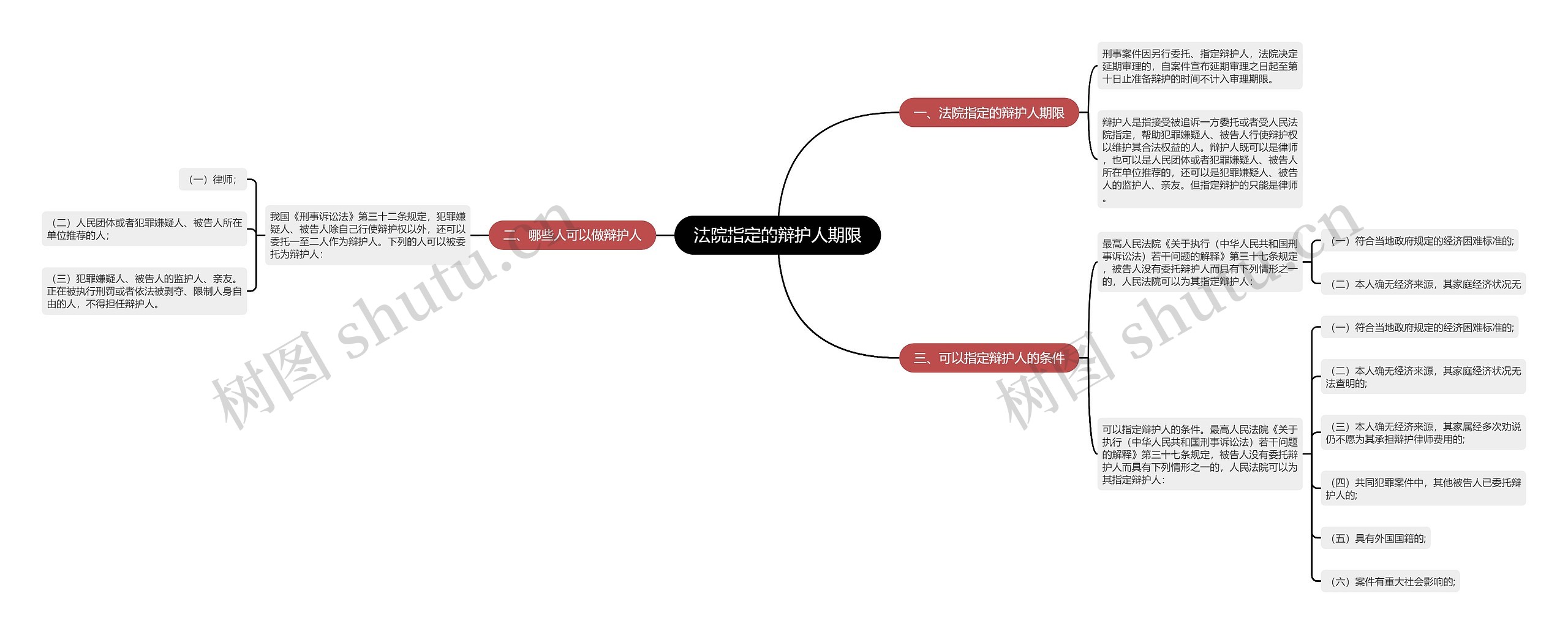树图思维导图提供《法院指定的辩护人期限》在线思维导图免费制作,点击“编辑”按钮,可对《法院指定的辩护人期限》进行在线思维导图编辑,本思维导图属于思维导图模板主题,文件编号是:120d18d0a2cd0479ab99d1ed6c7442d9