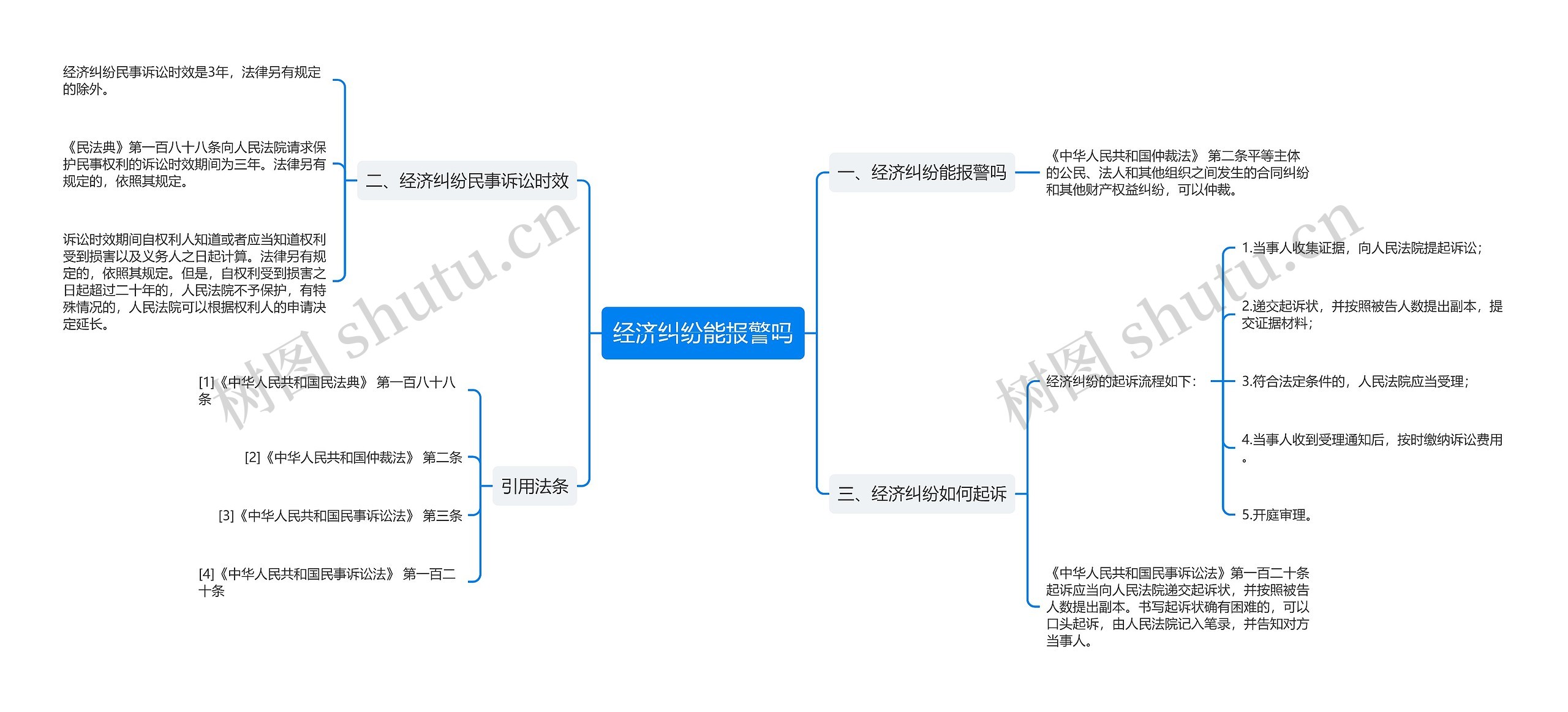 树图思维导图提供《经济纠纷能报警吗》在线思维导图免费制作,点击“编辑”按钮,可对《经济纠纷能报警吗》进行在线思维导图编辑,本思维导图属于思维导图模板主题,文件编号是:71ee35775f69b90c2b68a6a6fdd015f3