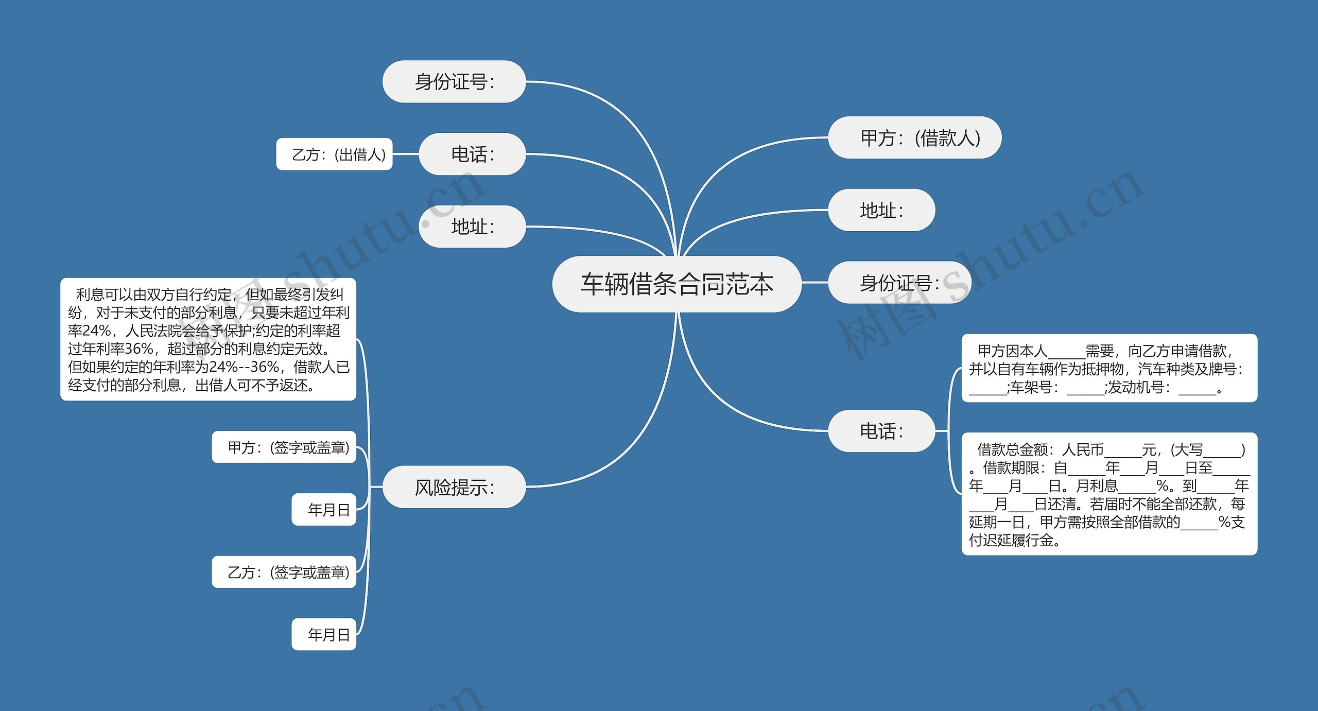 树图思维导图提供《车辆借条合同范本》在线思维导图免费制作,点击“编辑”按钮,可对《车辆借条合同范本》进行在线思维导图编辑,本思维导图属于思维导图模板主题,文件编号是:ce92c8a3ab4c05599fe418c3d9daac90