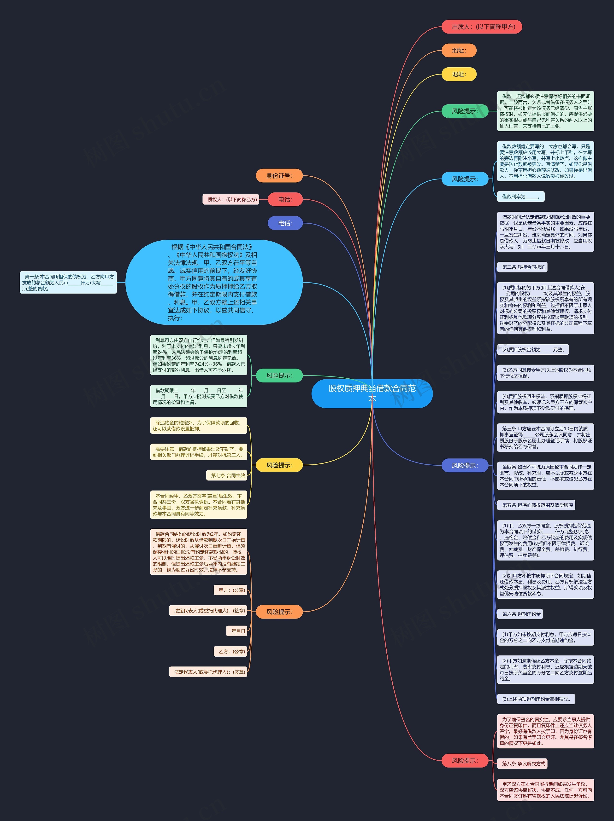 (1)质押标的为甲方(即上述合同借款人)在______公司的股权(______%)及其派生的权益。股权及其派生的权益系指该股权所享有的所有现实和将来的权利和利益,包括但不限于出质人对标的公司的投票权和其他管理权、请求支付红利或其他款项分配并收取该等款项的权利、剩余财产的分配权以及其在标的公司章程下享有的任何其他权利和利益。