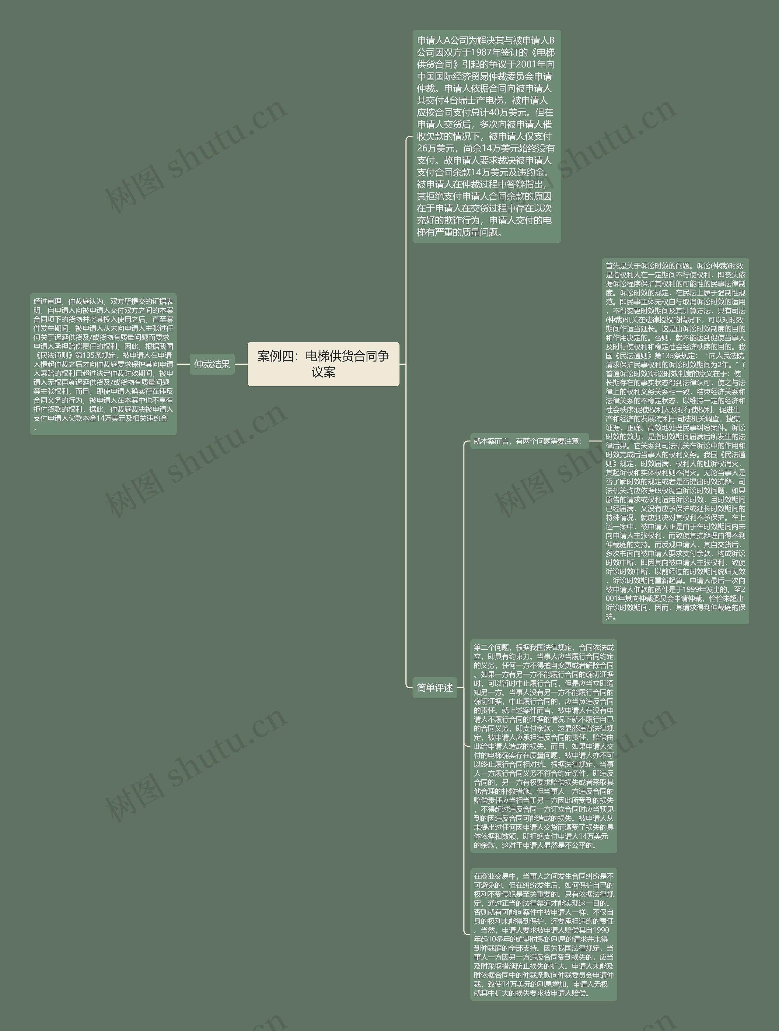 首先是关于诉讼时效的问题。诉讼(仲裁)时效是指权利人在一定期间不行使权利,即丧失依据诉讼程序保护其权利的可能性的民事法律制度。诉讼时效的规定,在民法上属于强制性规范。即民事主体无权自行取消诉讼时效的适用,不得变更时效期间及其计算方法,只有司法(仲裁)机关在法律授权的情况下,可以对时效期间作适当延长。这是由诉讼时效制度的目的和作用决定的。否则,就不能达到促使当事人及时行使权利和稳定社会经济秩序的目的。我国《民法通则》第135条规定:“向人民法院请求保护民事权利的诉讼时效期间为2年。”(普通诉讼时效)诉讼时效制度的意义在于:使长期存在的事实状态得到法律认可,使之与法律上的权利义务关系相一致,结束经济关系和法律关系的不稳定状态,以维持一定的经济和社会秩序;促使权利人及时行使权利,促进生产和经济的发展;有利于司法机关调查、搜集证据,正确、高效地处理民事纠纷案件。诉讼时效的效力,是指时效期间届满后所发生的法律后果。它关系到司法机关在诉讼中的作用和时效完成后当事人的权利义务。我国《民法通则》规定,时效届满,权利人的胜诉权消灭,其起诉权和实体权利则不消灭。无论当事人是否了解时效的规定或者是否提出时效抗辩,司法机关均应依据职权调查诉讼时效问题,如果原告的请求或权利适用诉讼时效,且时效期间已经届满,又没有应予保护或延长时效期间的特殊情况,就应判决对其权利不予保护。在上述一案中,被申请人正是由于在时效期间内未向申请人主张权利,而致使其抗辩理由得不到仲裁庭的支持。而反观申请人,其自交货后,多次书面向被申请人要求支付余款,构成诉讼时效中断,即因其向被申请人主张权利,致使诉讼时效中断,以前经过的时效期间统归无效,诉讼时效期间重新起算。申请人最后一次向被申请人催款的函件是于1999年发出的,至2001年其向仲裁委员会申请仲裁,恰恰未超出诉讼时效期间,因而,其请求得到仲裁庭的保护。