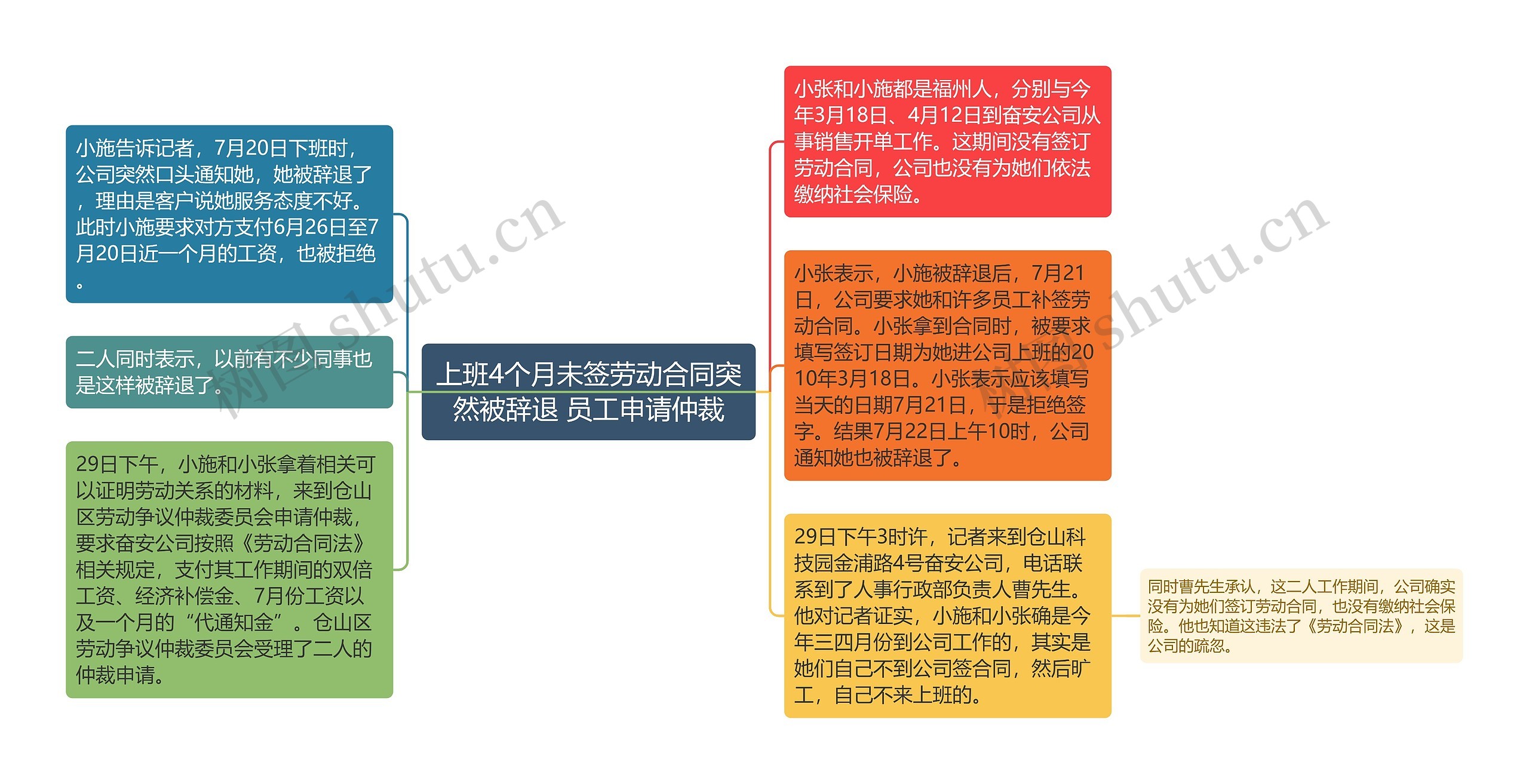29日下午,小施和小张拿着相关可以证明劳动关系的材料,来到仓山区劳动争议仲裁委员会申请仲裁,要求奋安公司按照《劳动合同法》相关规定,支付其工作期间的双倍工资、经济补偿金、7月份工资以及一个月的“代通知金”。仓山区劳动争议仲裁委员会受理了二人的仲裁申请。