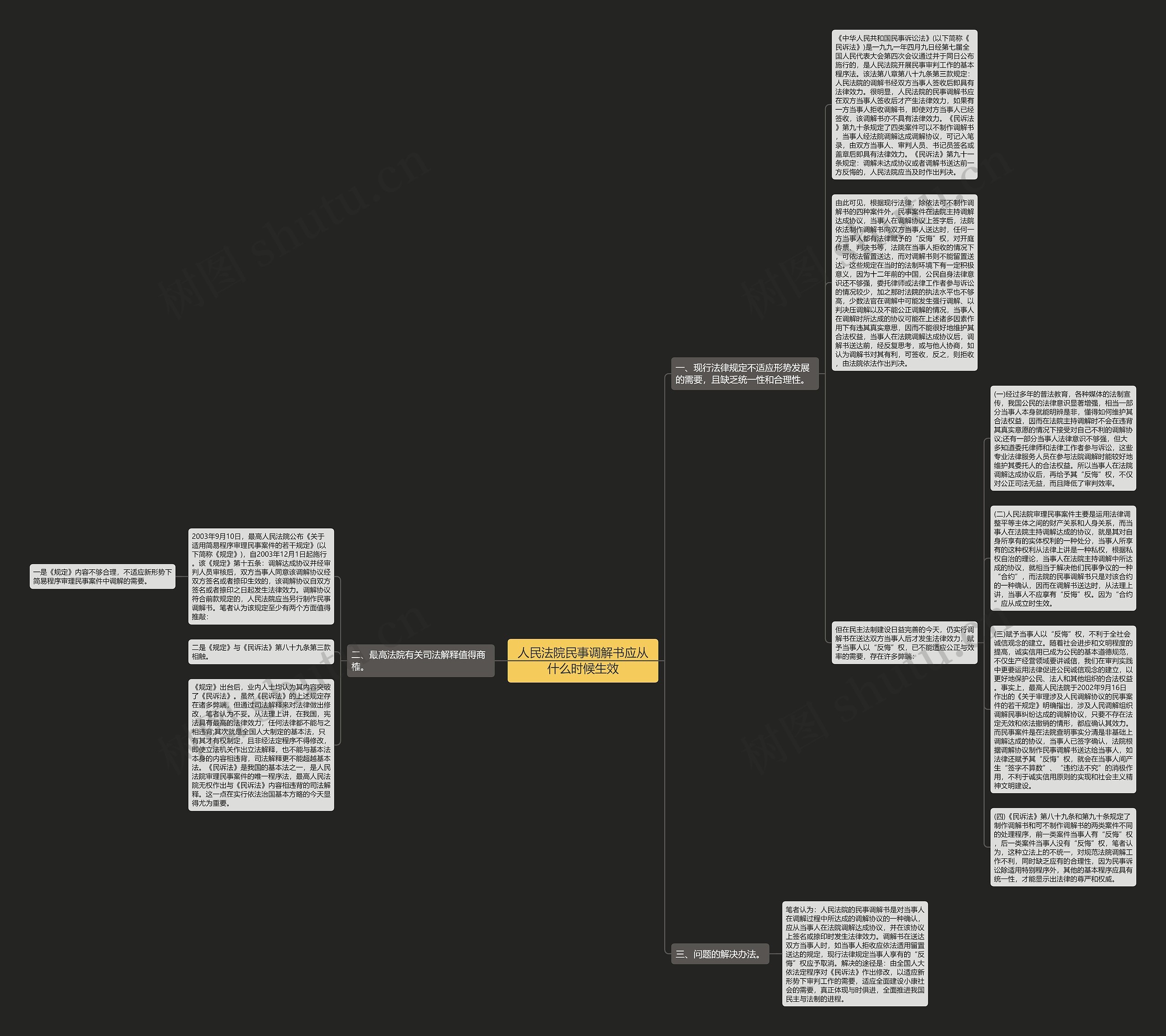 (二)人民法院审理民事案件主要是运用法律调整平等主体之间的财产关系和人身关系,而当事人在法院主持调解达成的协议,就是其对自身所享有的实体权利的一种处分,当事人所享有的这种权利从法律上讲是一种私权,根据私权自治的理论,当事人在法院主持调解中所达成的协议,就相当于解决他们民事争议的一种“合约”,而法院的民事调解书只是对该合约的一种确认,因而在调解书送达时,从法理上讲,当事人不应享有“反悔”权。因为“合约”应从成立时生效。