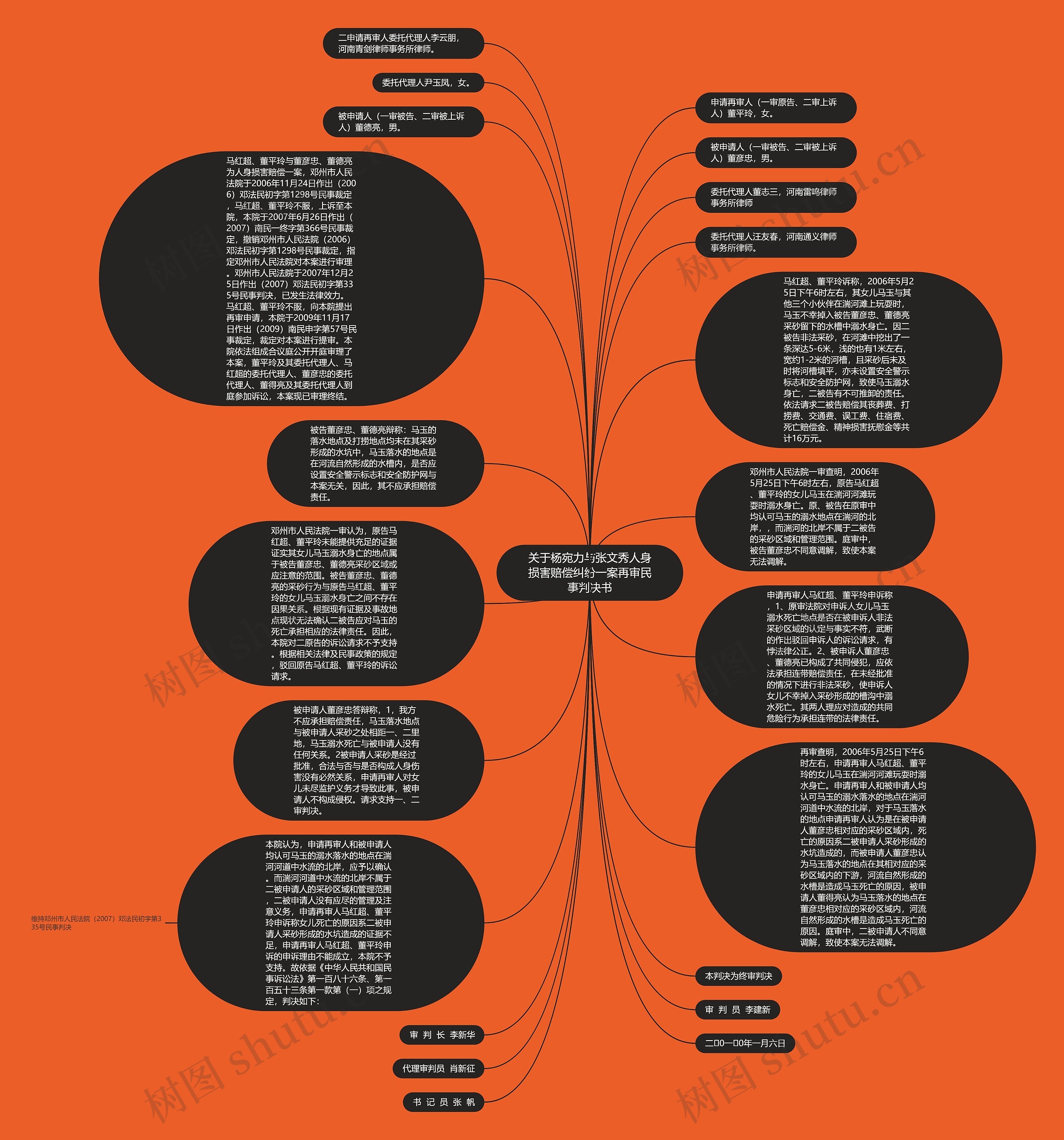 再审查明,2006年5月25日下午6时左右,申请再审人马红超、董平玲的女儿马玉在湍河河滩玩耍时溺水身亡。申请再审人和被申请人均认可马玉的溺水落水的地点在湍河河道中水流的北岸,对于马玉落水的地点申请再审人认为是在被申请人董彦忠相对应的采砂区域内,死亡的原因系二被申请人采砂形成的水坑造成的,而被申请人董彦忠认为马玉落水的地点在其相对应的采砂区域内的下游,河流自然形成的水槽是造成马玉死亡的原因,被申请人董得亮认为马玉落水的地点在董彦忠相对应的采砂区域内,河流自然形成的水槽是造成马玉死亡的原因。庭审中,二被申请人不同意调解,致使本案无法调解。