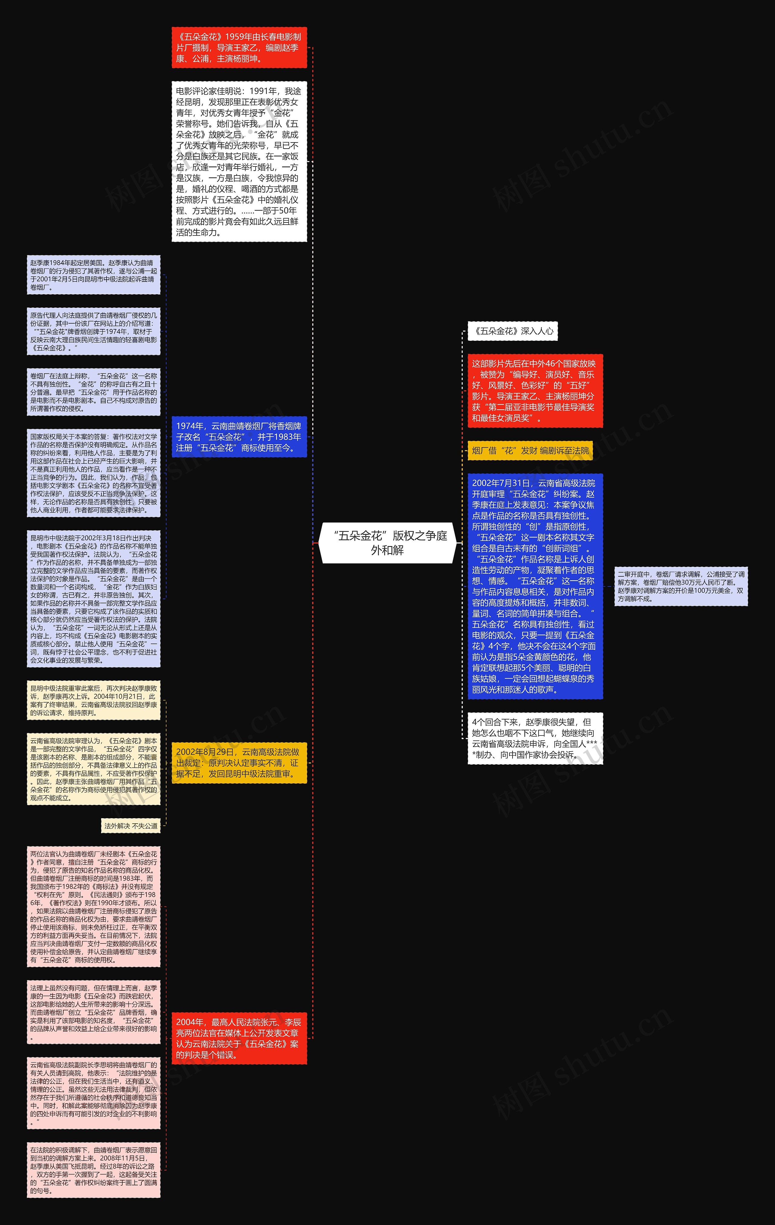 昆明市中级法院于2002年3月18日作出判决,电影剧本《五朵金花》的作品名称不能单独受我国著作权法保护。法院认为,“五朵金花”作为作品的名称,并不具备单独成为一部独立完整的文学作品应当具备的要素,而著作权法保护的对象是作品。“五朵金花”是由一个数量词和一个名词构成,“金花”作为白族妇女的称谓,古已有之,并非原告独创。其次,如果作品的名称并不具备一部完整文学作品应当具备的要素,只要它构成了该作品的实质和核心部分就仍然应当受著作权法的保护。法院认为,“五朵金花”一词无论从形式上还是从内容上,均不构成《五朵金花》电影剧本的实质或核心部分。禁止他人使用“五朵金花”一词,既有悖于社会公平理念,也不利于促进社会文化事业的发展与繁荣。
