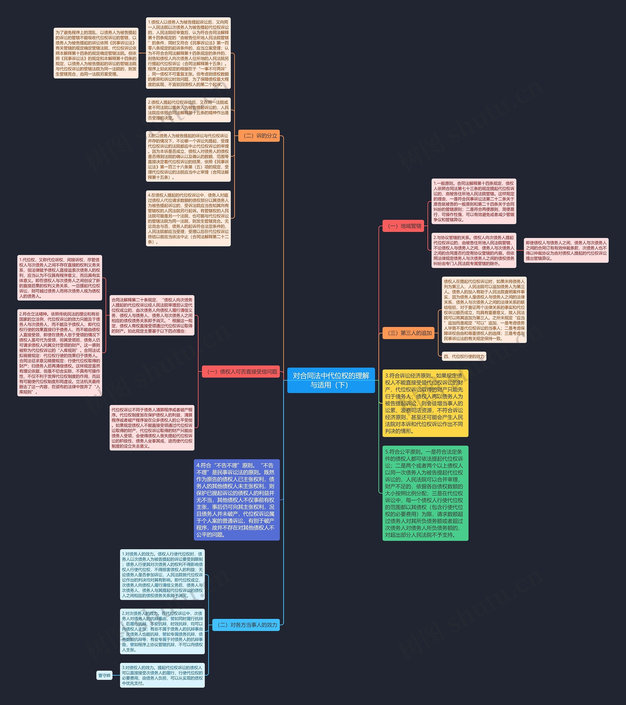 4.在债权人提起的代位权诉讼中,债务人对超过债权人代位请求数额的债权部分以其债务人为被告提起诉讼的,受诉法院应当告知其向有管辖权的人民法院另行起诉。有管辖权的人民法院可能是另一个法院,也可能与代位权诉讼的管辖法院为同一法院,则发生管辖竞合。无论竞合与否,债务人的起诉符合法定条件的,人民法院都应当受理;受理以后在代位权诉讼终结以前应当依法中止(合同法解释第二十二条)。