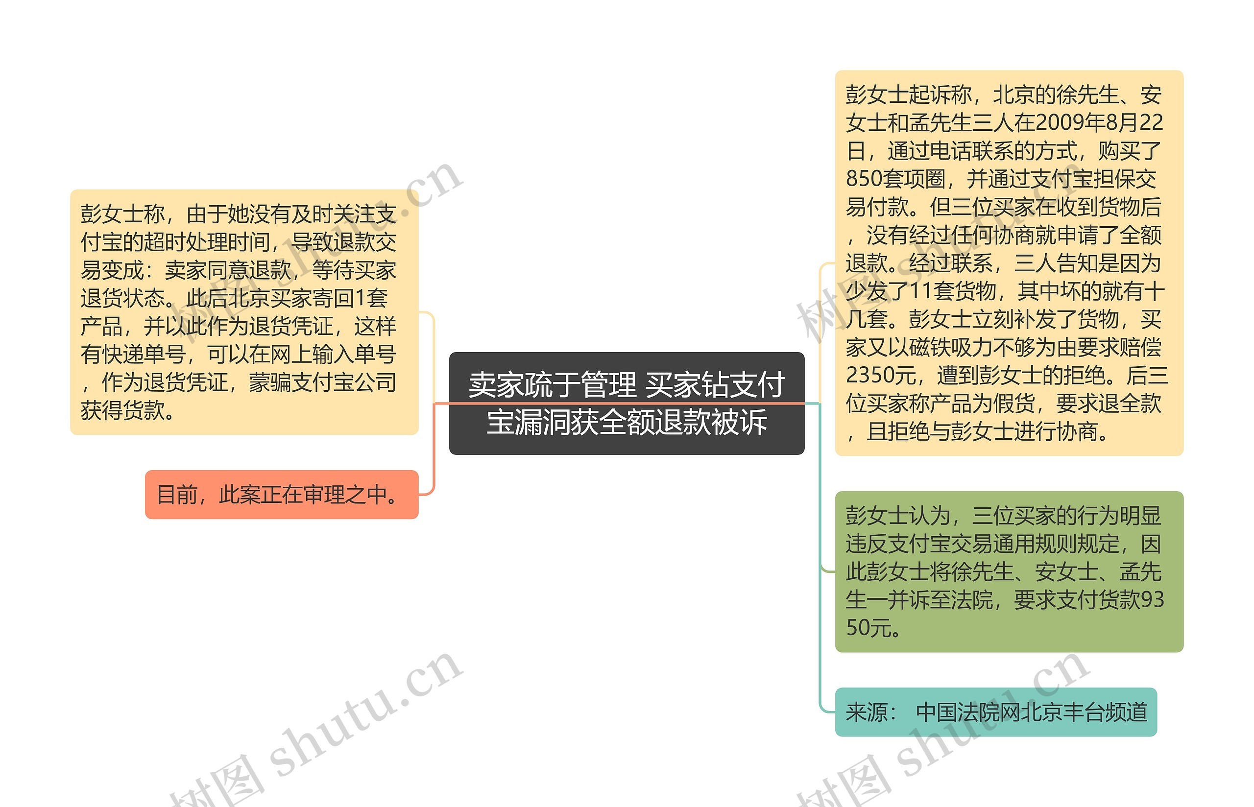 由于没有关注支付宝的超时处理时间,北京三位买家利用支付宝规则,用寄回一套价值11元商品的快递凭证,获得了卖家彭女士850套商品全额9350元的退款。日前,彭女士将三位买家诉至北京市丰台区人民法院,要求支付货款9350元。