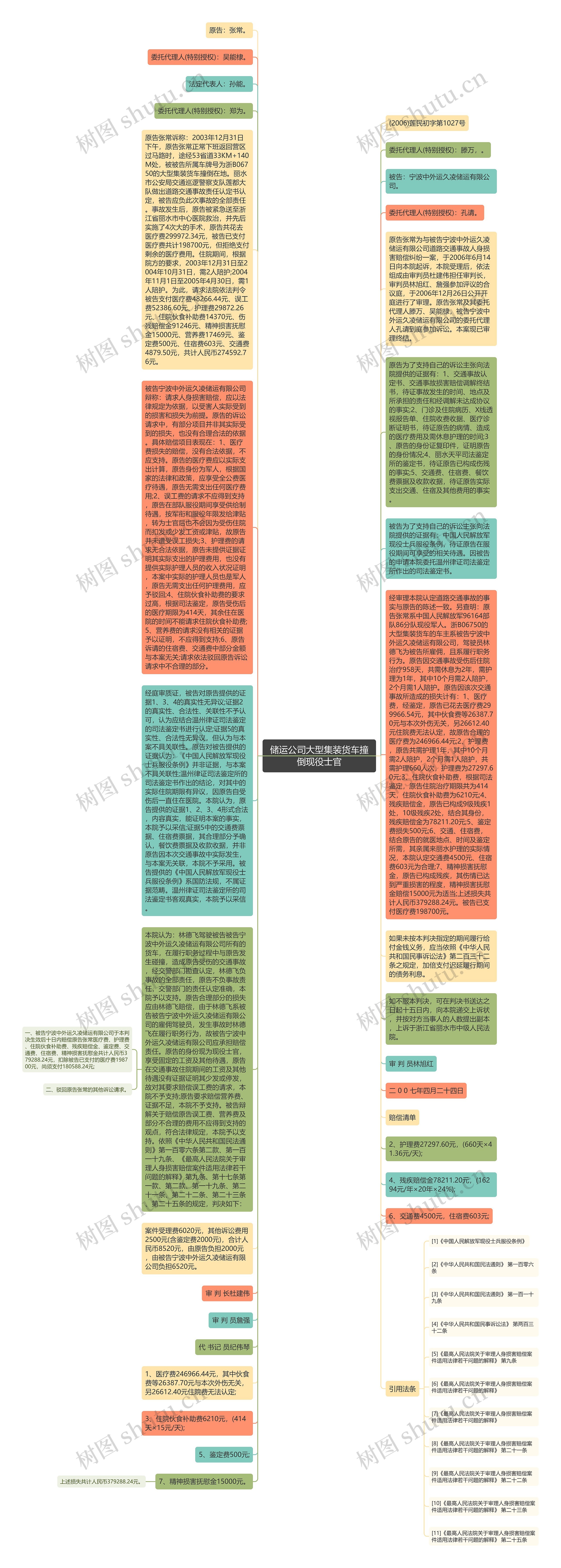 原告张常诉称:2003年12月31日下午,原告张常正常下班返回营区过马路时,途经53省道33KM+140M处,被被告所属车牌号为浙B06750的大型集装货车撞倒在地。丽水市公安局交通巡逻警察支队莲都大队做出道路交通事故责任认定书认定,被告应负此次事故的全部责任。事故发生后,原告被紧急送至浙江省丽水市中心医院救治,并先后实施了4次大的手术,原告共花去医疗费299972.34元,被告已支付医疗费共计198700元,但拒绝支付剩余的医疗费用。住院期间,根据院方的要求,2003年12月31日至2004年10月31日,需2人陪护;2004年11月1日至2005年4月30日,需1人陪护。为此,请求法院依法判令被告支付医疗费48266.44元、误工费52386.60元、护理费29872.26元、住院伙食补助费14370元、伤残赔偿金91246元、精神损害抚慰金15000元、营养费17469元、鉴定费500元、住宿费603元、交通费4879.50元,共计人民币274592.76元。