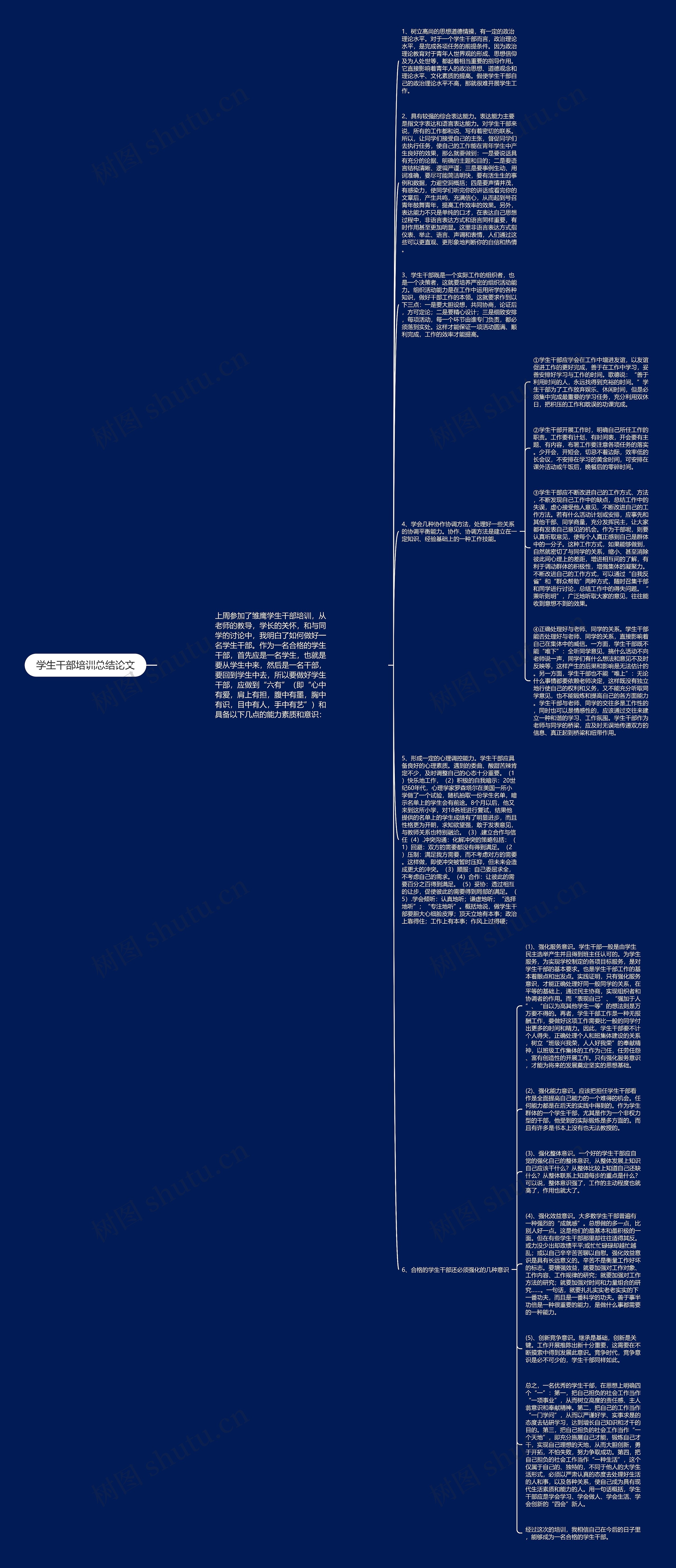 (3)、强化整体意识。一个好的学生干部应自觉的强化自己的整体意识,从整体发展上知识自己应该干什么?从整体比较上知道自己还缺什么?从整体联系上知道每步的重点是什么?可以说,整体意识强了,工作的主动程度也就高了,作用也就大了。
