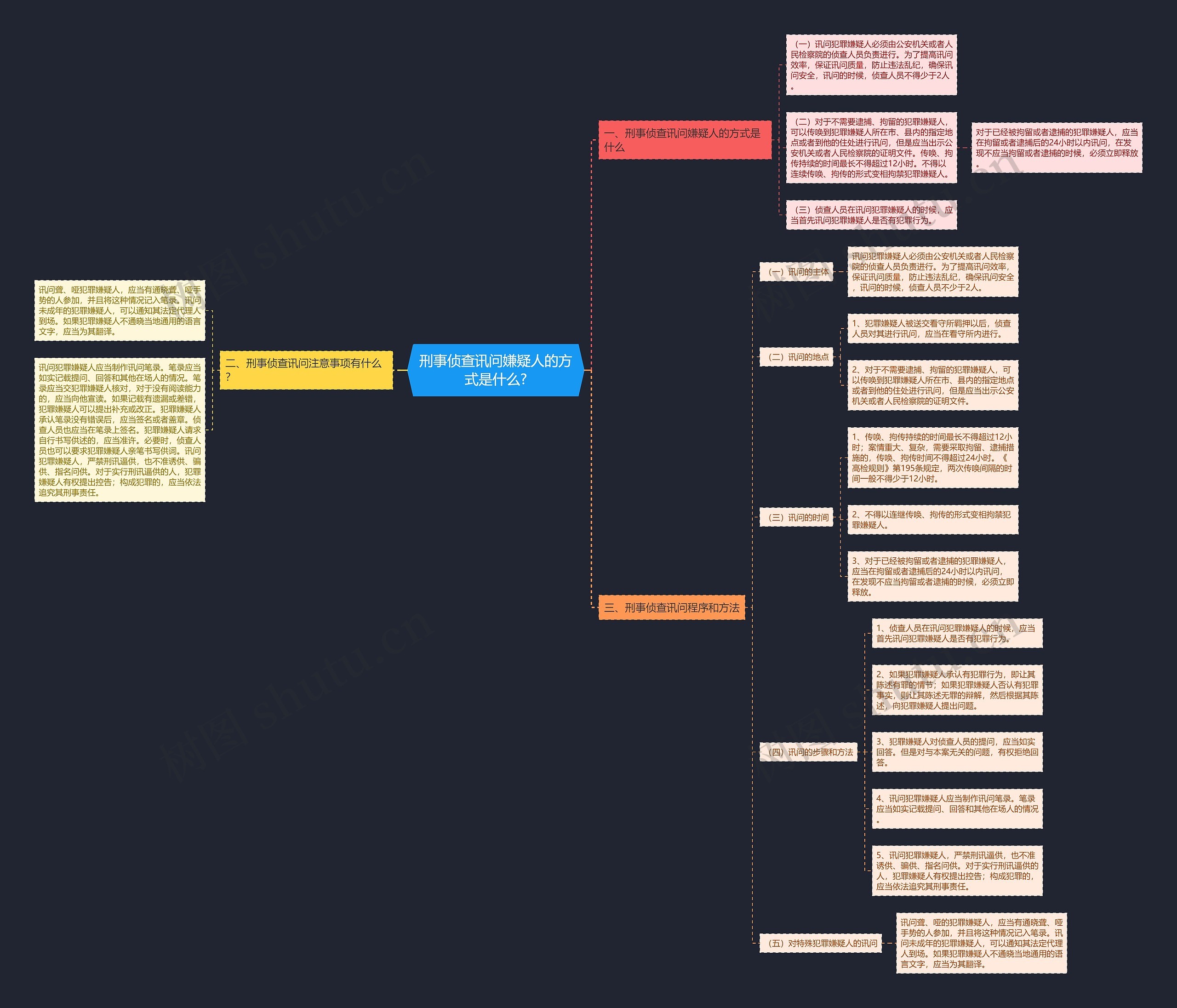 树图思维导图提供《刑事侦查讯问嫌疑人的方式是什么?》在线思维导图免费制作,点击“编辑”按钮,可对《刑事侦查讯问嫌疑人的方式是什么?》进行在线思维导图编辑,本思维导图属于思维导图模板主题,文件编号是:6d49519b17f975260d2b20dd4afec700