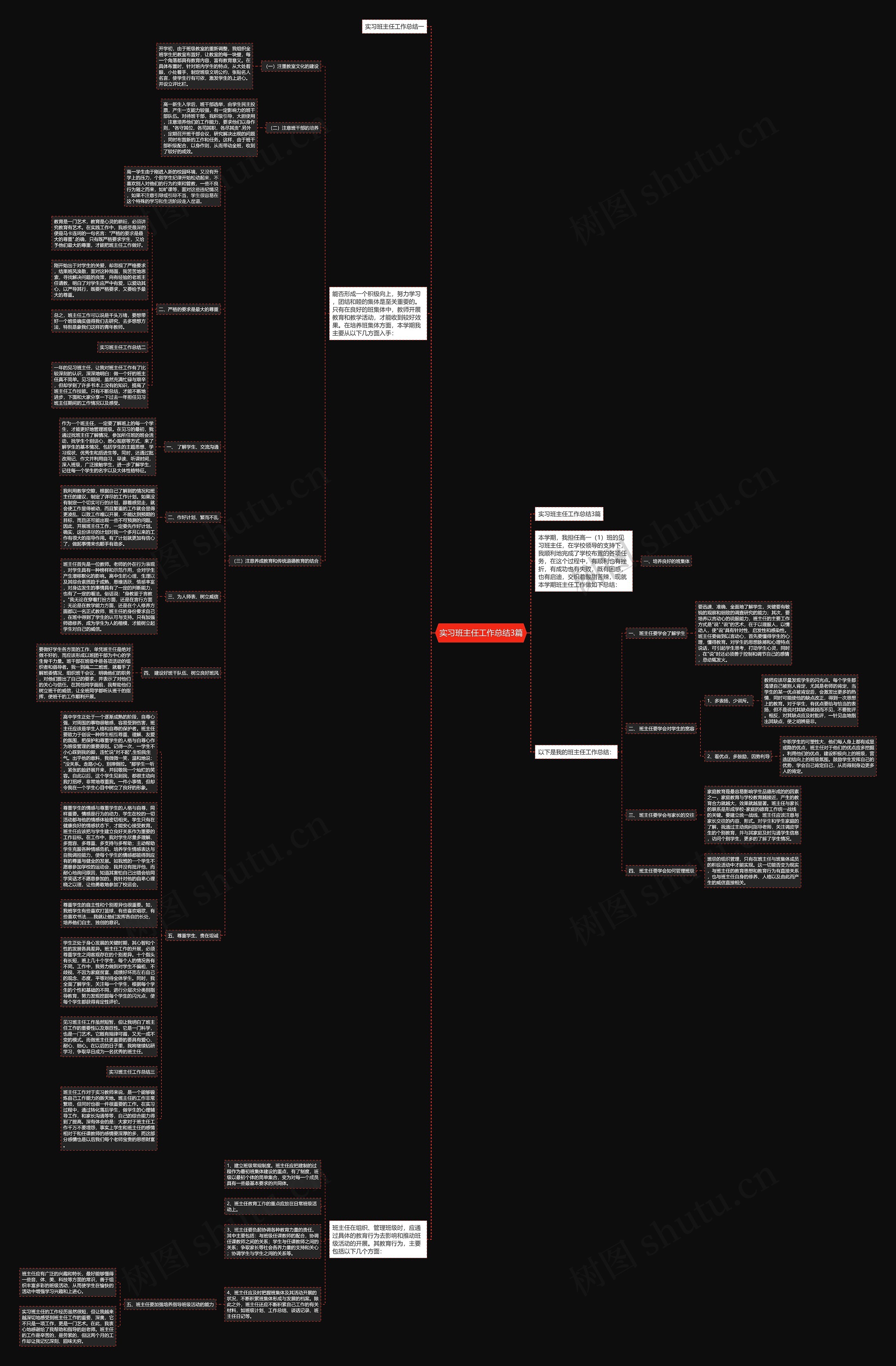 班主任工作对于实习教师来说,是一个能够锻炼自己工作能力的新天地。班主任的工作非常繁琐,但同时也很一件很重要的工作。在实习过程中,通过转化落后学生,做学生的心理辅导工作,和家长沟通等等,自己的综合能力得到了提高。深有体会的是:大家对于班主任工作千万不要埋怨,事实上学生和班主任的感情相对于和任课教师的感情要深厚的多,而这部分感情也是以后我们每个老师宝贵的思想财富。