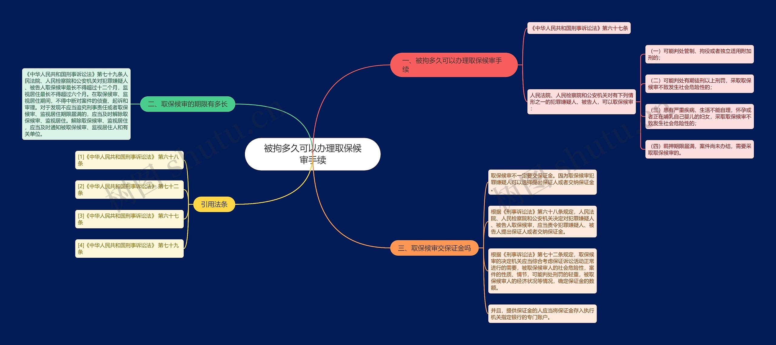 树图思维导图提供《被拘多久可以办理取保候审手续》在线思维导图免费制作,点击“编辑”按钮,可对《被拘多久可以办理取保候审手续》进行在线思维导图编辑,本思维导图属于思维导图模板主题,文件编号是:a4d66c19a8d8f8a1f24c23fa412c4f40
