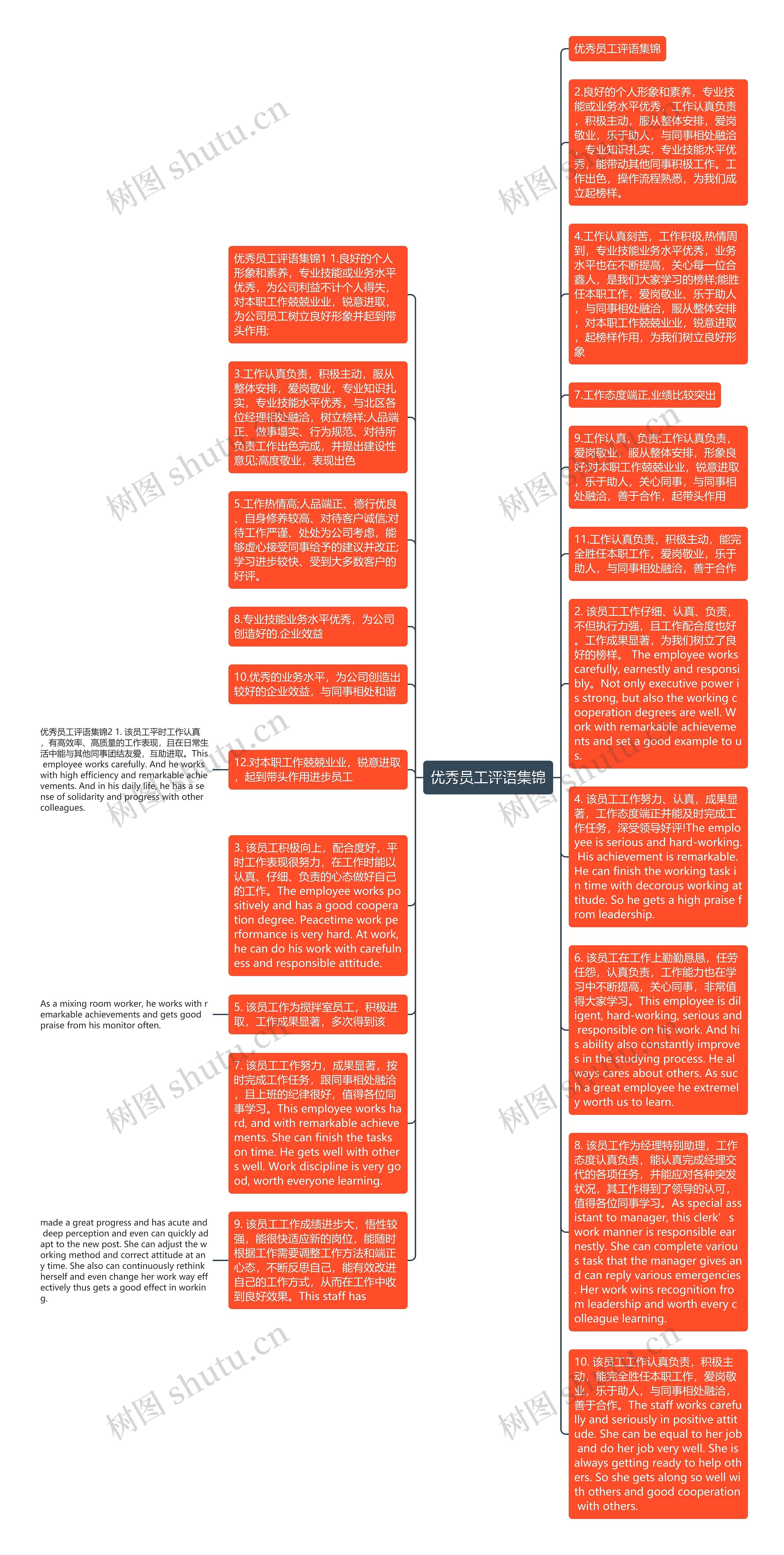 优秀员工评语集锦2 1. 该员工平时工作认真,有高效率、高质量的工作表现,且在日常生活中能与其他同事团结友爱,互助进取。This employee works carefully. And he works with high efficiency and remarkable achievements. And in his daily life, he has a sense of solidarity and progress with other colleagues.