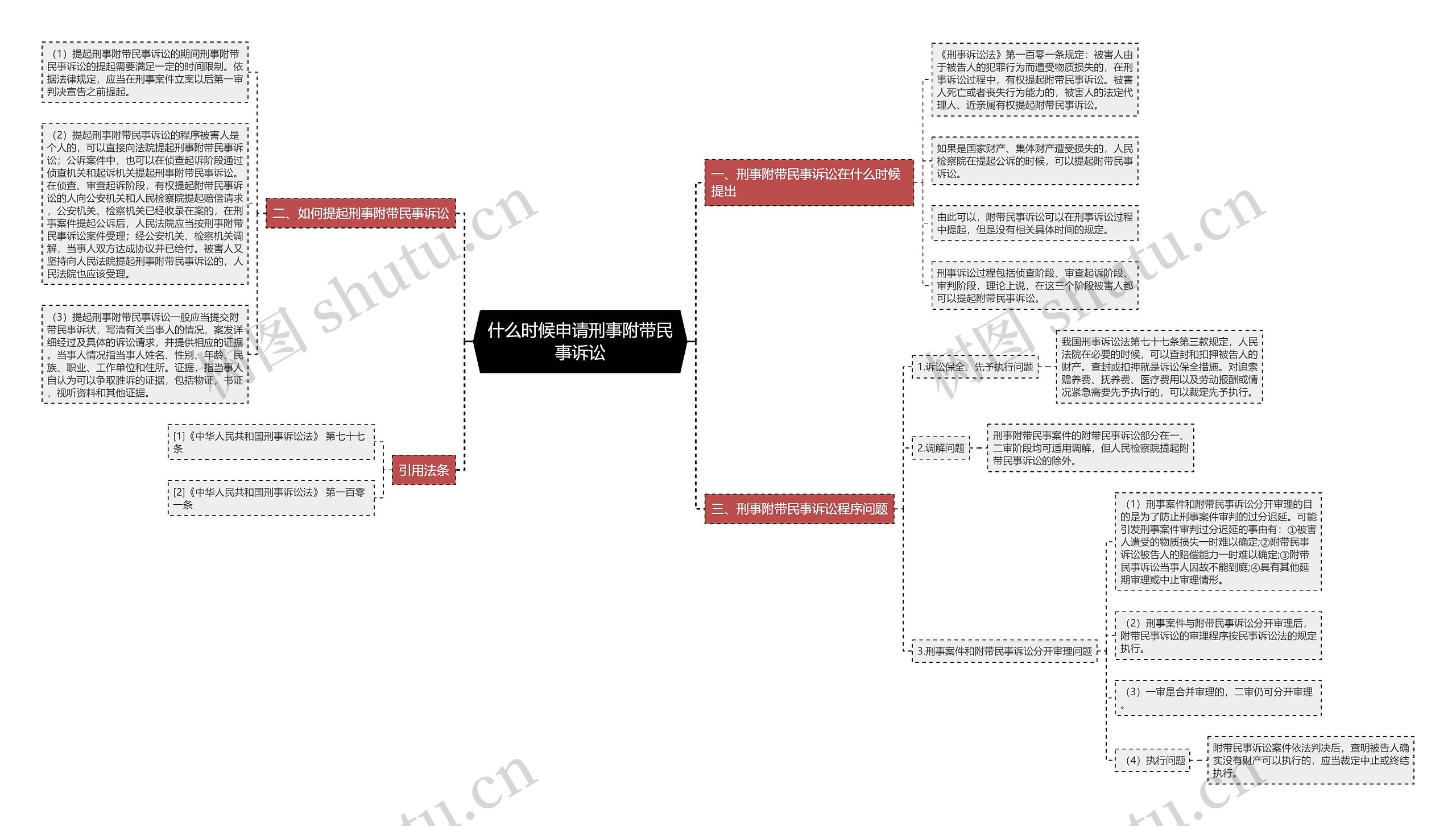 树图思维导图提供《什么时候申请刑事附带民事诉讼》在线思维导图免费制作,点击“编辑”按钮,可对《什么时候申请刑事附带民事诉讼》进行在线思维导图编辑,本思维导图属于思维导图模板主题,文件编号是:5ca4fbc5d540589261f55d900aeccc09