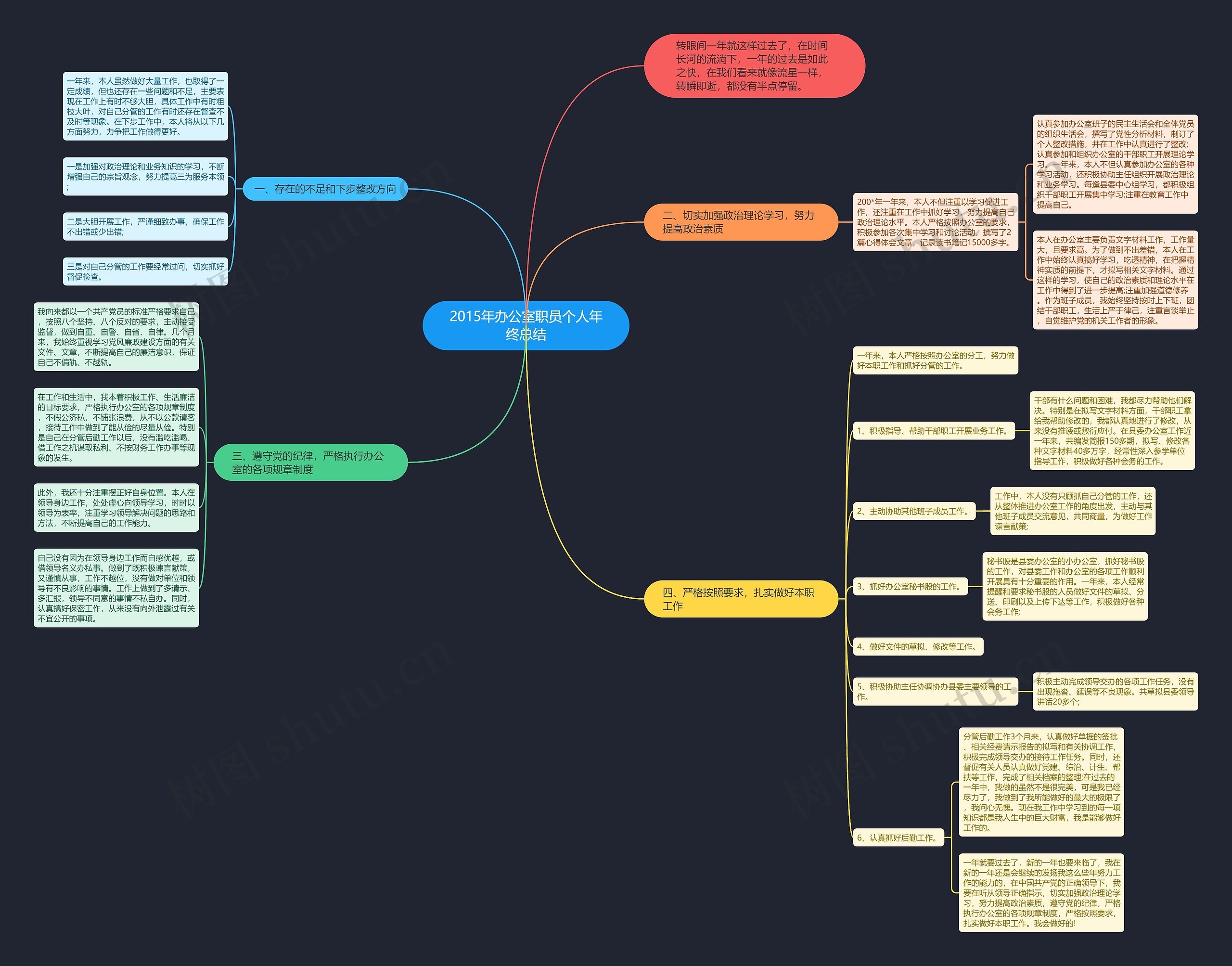 树图思维导图提供《2015年办公室职员个人年终总结》在线思维导图免费制作,点击“编辑”按钮,可对《2015年办公室职员个人年终总结》进行在线思维导图编辑,本思维导图属于思维导图模板主题,文件编号是:8e2b71a0ba713148462eca6dd236510d