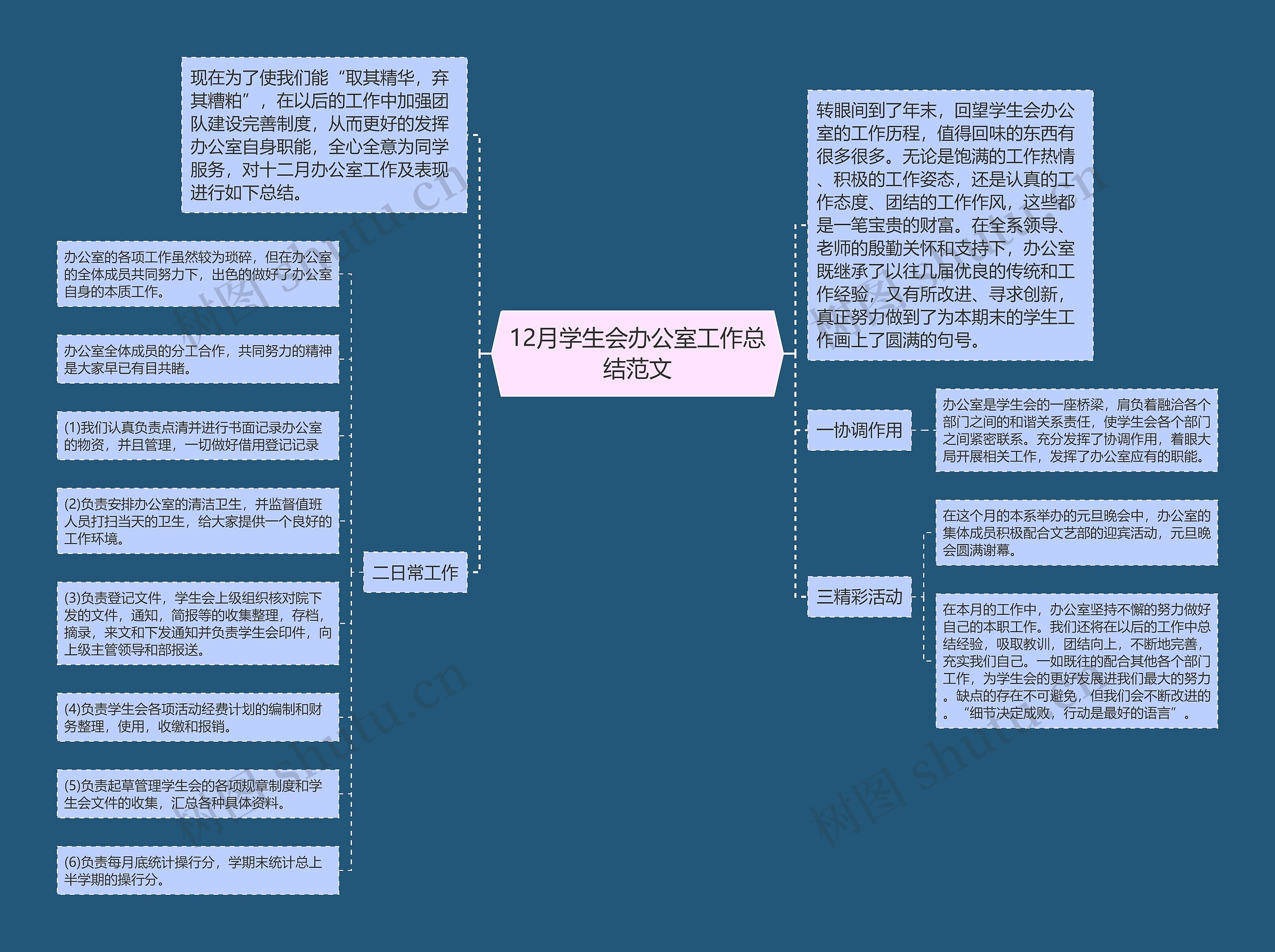 树图思维导图提供《12月学生会办公室工作总结范文》在线思维导图免费制作,点击“编辑”按钮,可对《12月学生会办公室工作总结范文》进行在线思维导图编辑,本思维导图属于思维导图模板主题,文件编号是:2721ff295408afa46139eb3bb963af6a