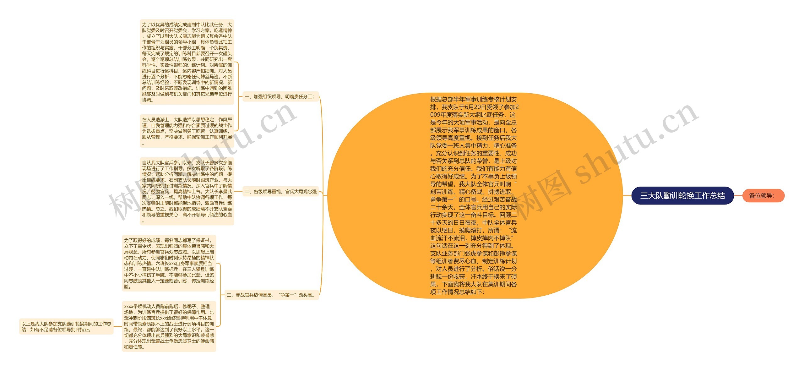 树图思维导图提供《三大队勤训轮换工作总结》在线思维导图免费制作,点击“编辑”按钮,可对《三大队勤训轮换工作总结》进行在线思维导图编辑,本思维导图属于思维导图模板主题,文件编号是:9f8cc725d6e3221931531c7e19353a06