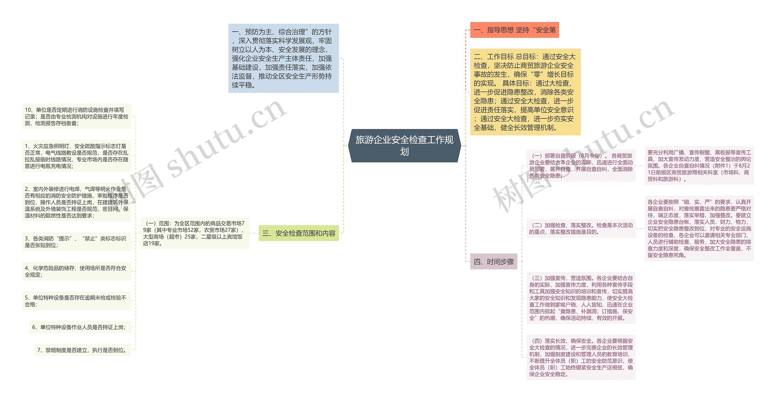 树图思维导图提供《旅游企业安全检查工作规划》在线思维导图免费制作,点击“编辑”按钮,可对《旅游企业安全检查工作规划》进行在线思维导图编辑,本思维导图属于思维导图模板主题,文件编号是:69dd96146a41aaa556fb4f79e579276f