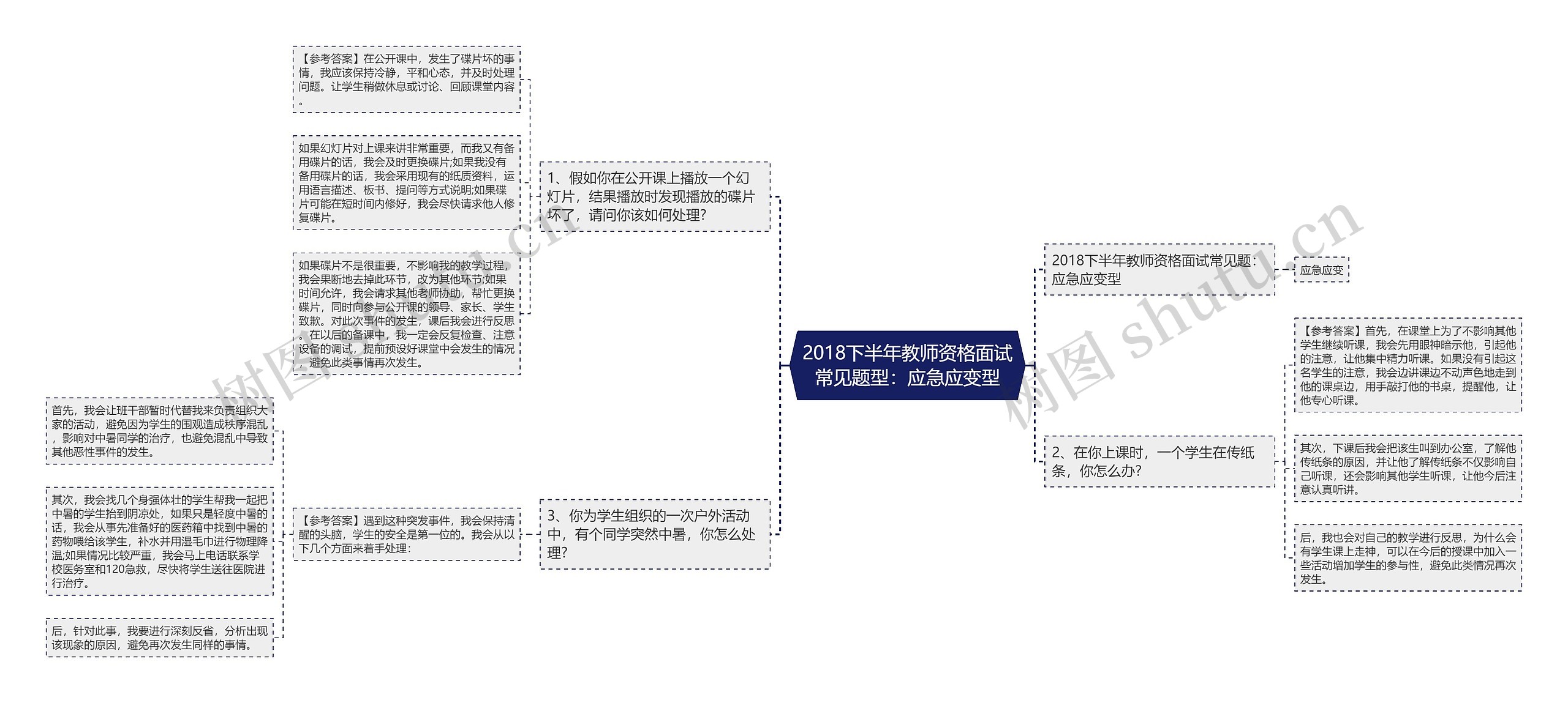 树图思维导图提供《2018下半年教师资格面试常见题型:应急应变型》在线思维导图免费制作,点击“编辑”按钮,可对《2018下半年教师资格面试常见题型:应急应变型》进行在线思维导图编辑,本思维导图属于思维导图模板主题,文件编号是:f28af3eb6caf6582a635170779f82ed3