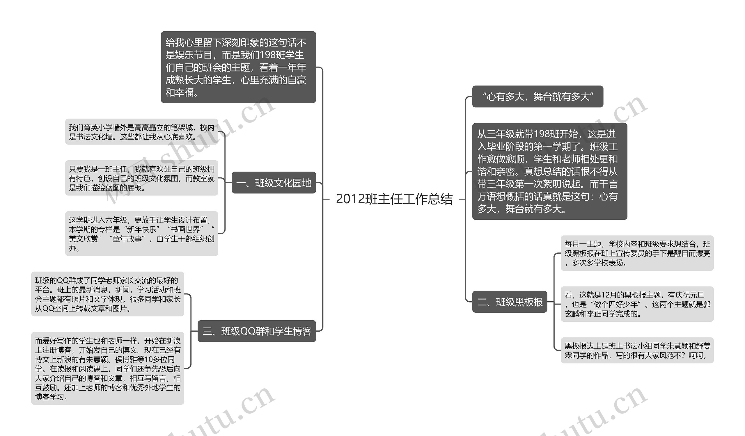 树图思维导图提供《2012班主任工作总结》在线思维导图免费制作,点击“编辑”按钮,可对《2012班主任工作总结》进行在线思维导图编辑,本思维导图属于思维导图模板主题,文件编号是:d09e3dc049d04cd065fc4124b65e557a