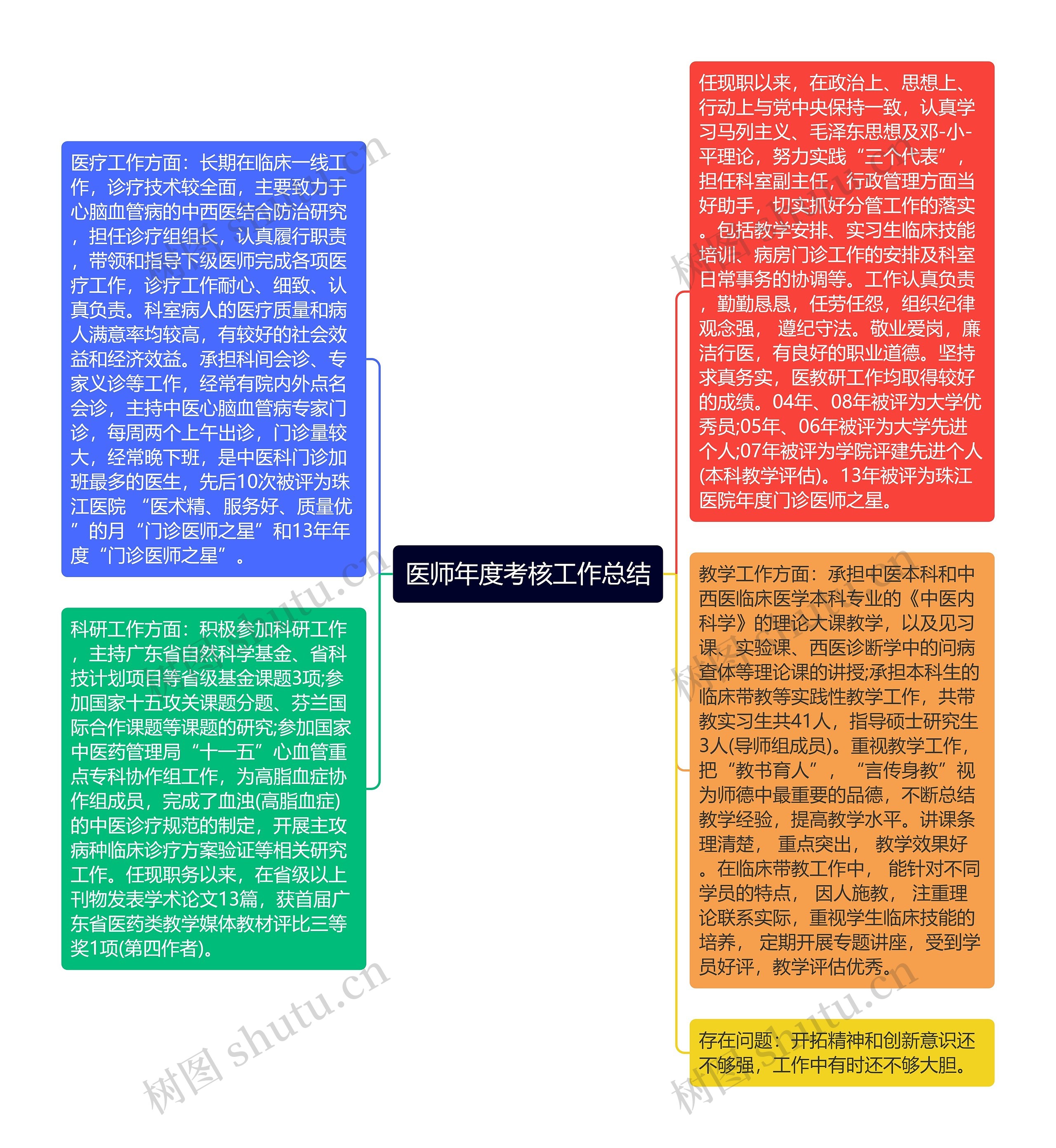 任现职以来,在政治上、思想上、行动上与党中央保持一致,认真学习马列主义、毛泽东思想及邓-小-平理论,努力实践“三个代表”,担任科室副主任,行政管理方面当好助手,切实抓好分管工作的落实。包括教学安排、实习生临床技能培训、病房门诊工作的安排及科室日常事务的协调等。工作认真负责,勤勤恳恳,任劳任怨,组织纪律观念强, 遵纪守法。敬业爱岗,廉洁行医,有良好的职业道德。坚持求真务实,医教研工作均取得较好的成绩。04年、08年被评为大学优秀员;05年、06年被评为大学先进个人;07年被评为学院评建先进个人(本科教学评估)。13年被评为珠江医院年度门诊医师之星。