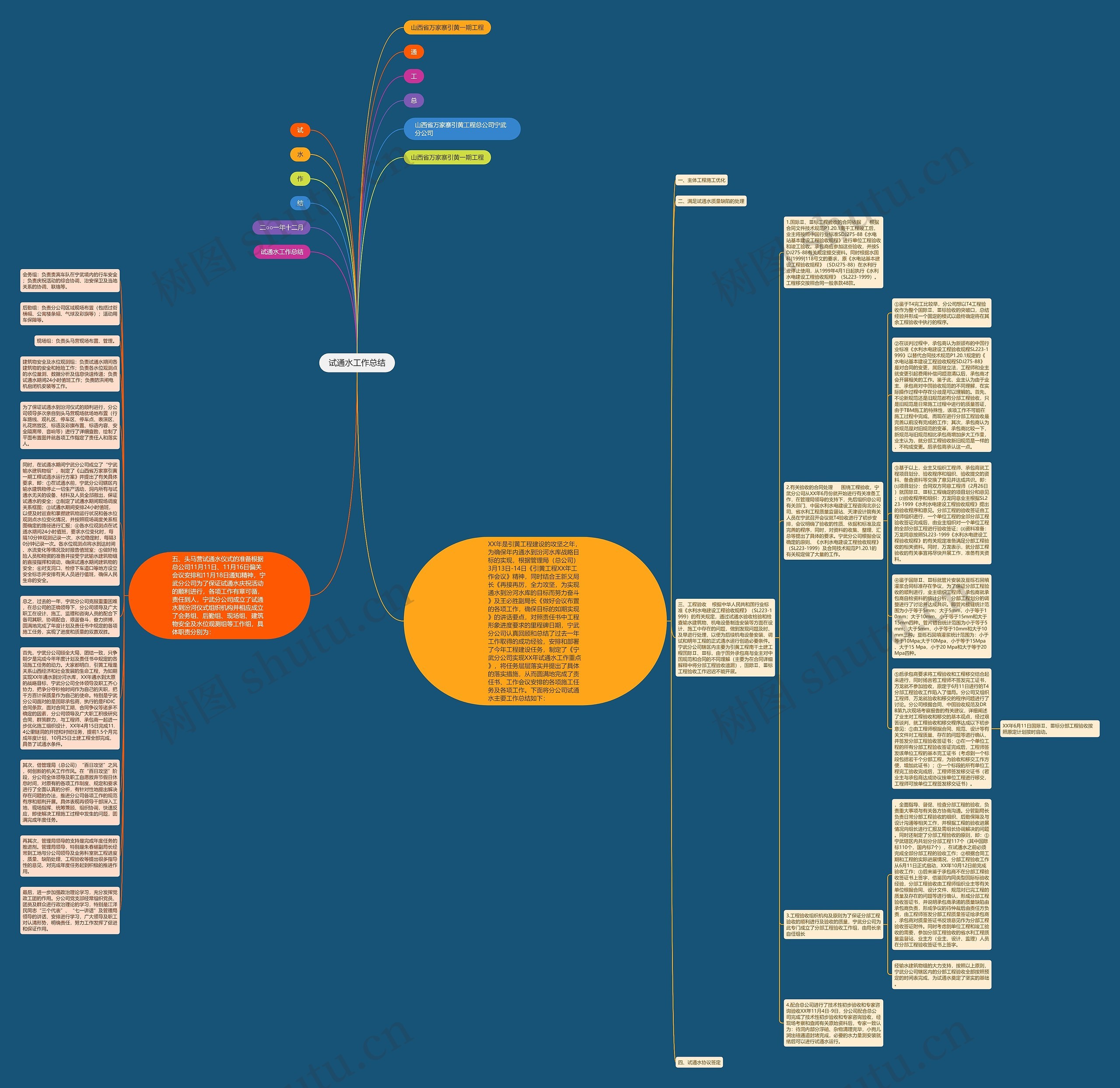 同时,在试通水期间宁武分公司成立了“宁武输水建筑物组”,制定了《山西省万家寨引黄一期工程试通水运行方案》并提出了有关具体要求,即:①在试通水前,宁武分公司辖区内输水建筑物停止一切生产活动,洞内所有与试通水无关的设备、材料及人员全部撤出,保证试通水的安全;②制定了试通水期间现场调度关系框图;③试通水期间安排24小时值班,以便及时巡查和掌握建筑物运行状况和各水位观测点水位变化情况,并按照现场调度关系框图确定的路径进行汇报;④各水位观测点在试通水期间24小时值班,要求水位变化时,每隔10分钟观测记录一次,水位稳定时,每隔30分钟记录一次。各水位观测点将水到达时间、水流变化等情况及时报告值班室;⑤做好抢险人员和物资的准备并接受宁武输水建筑物组的直接指挥和调动,确保试通水期间建筑物的安全;⑥对支洞口、检修下车道口等地方设立安全标志并安排有关人员进行值班,确保人民生命的安全。