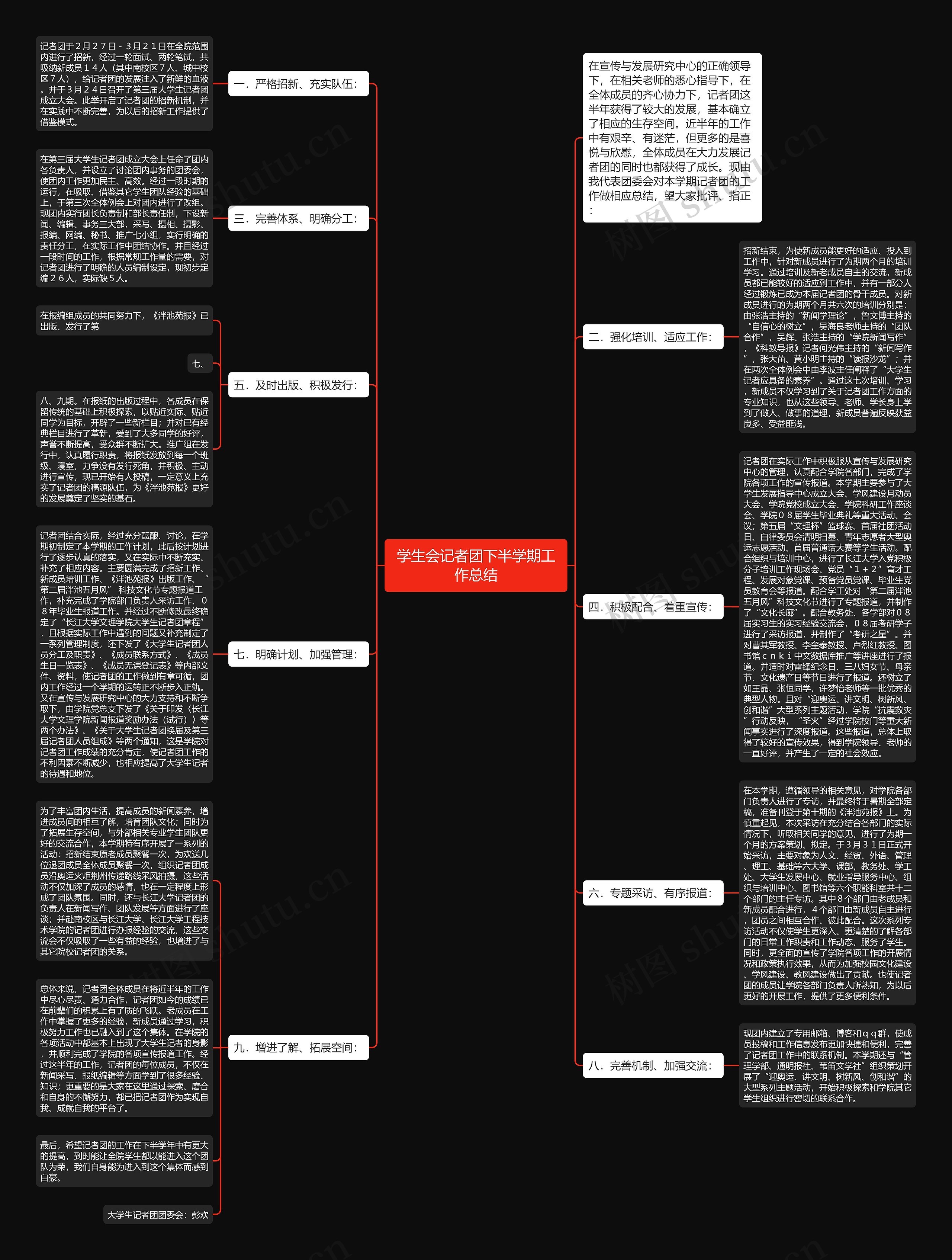 树图思维导图提供《学生会记者团下半学期工作总结》在线思维导图免费制作,点击“编辑”按钮,可对《学生会记者团下半学期工作总结》进行在线思维导图编辑,本思维导图属于思维导图模板主题,文件编号是:fee0124e93ba44fc90288aeeb05034c3