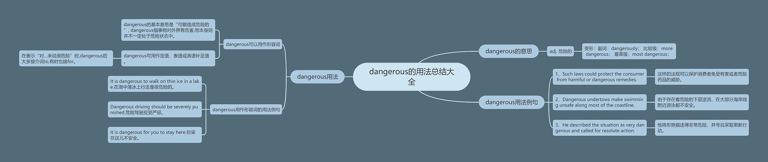 树图思维导图提供《dangerous的用法总结大全》在线思维导图免费制作,点击“编辑”按钮,可对《dangerous的用法总结大全》进行在线思维导图编辑,本思维导图属于思维导图模板主题,文件编号是:73f5863e58de9015012a489cd51d326b