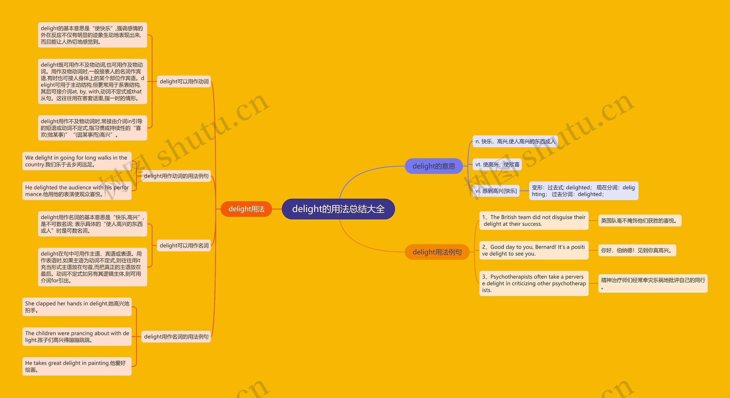 树图思维导图提供《delight的用法总结大全》在线思维导图免费制作,点击“编辑”按钮,可对《delight的用法总结大全》进行在线思维导图编辑,本思维导图属于思维导图模板主题,文件编号是:f68d0aeff34b7ef1bfef186a048e3f68