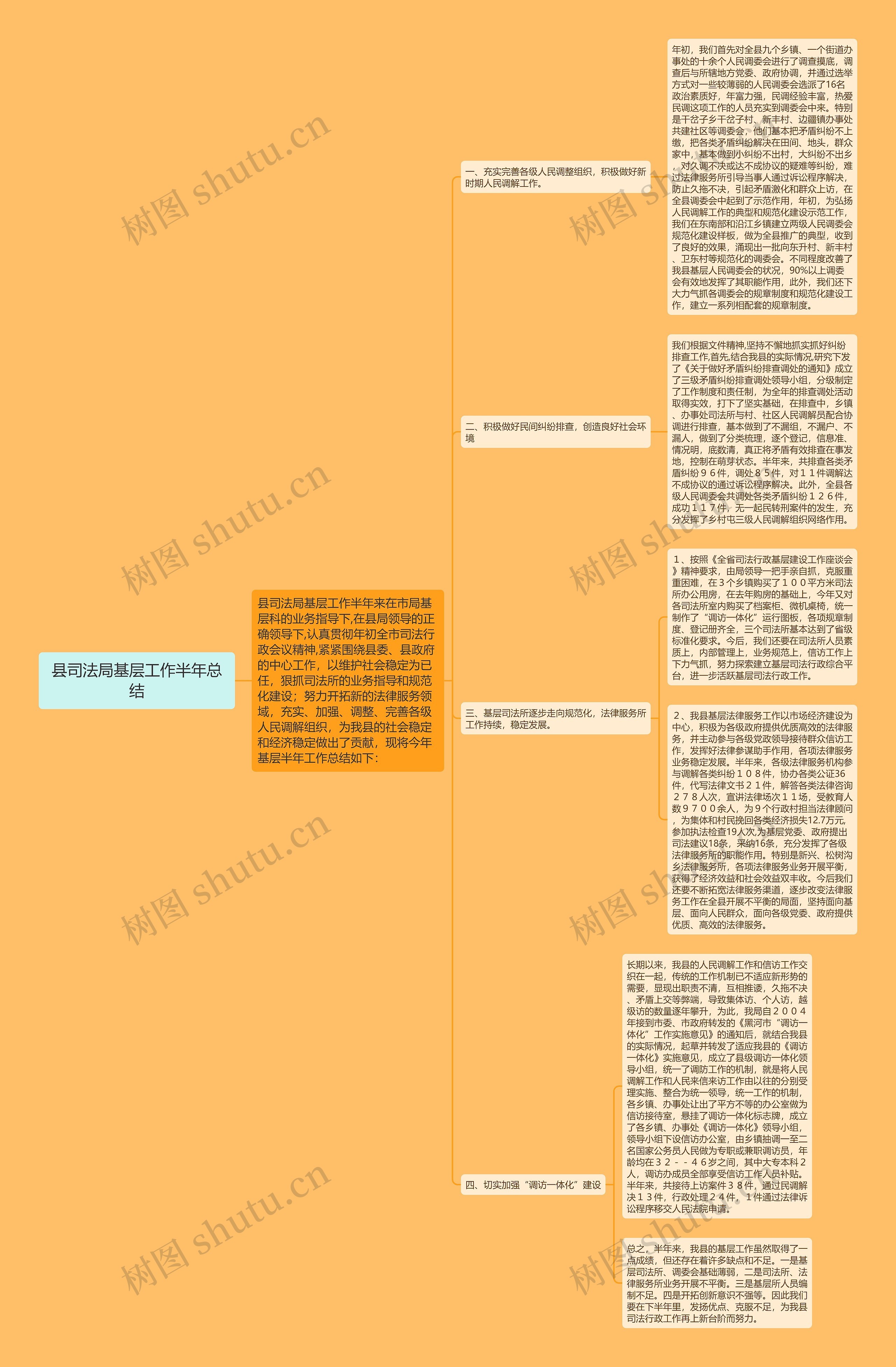 树图思维导图提供《县司法局基层工作半年总结》在线思维导图免费制作,点击“编辑”按钮,可对《县司法局基层工作半年总结》进行在线思维导图编辑,本思维导图属于思维导图模板主题,文件编号是:ffd1ece20f0b6b005155ab1bd67fa9de