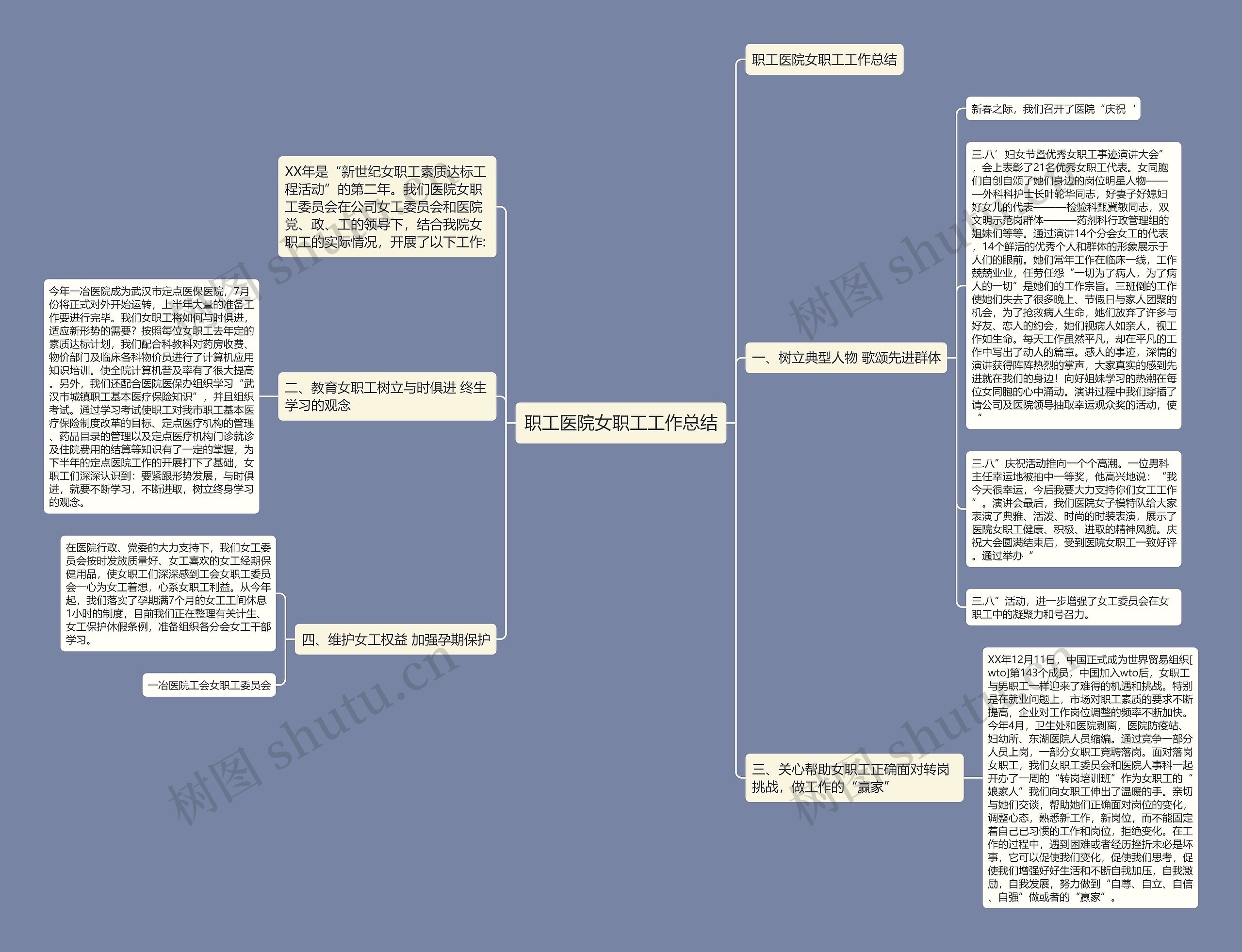 树图思维导图提供《职工医院女职工工作总结》在线思维导图免费制作,点击“编辑”按钮,可对《职工医院女职工工作总结》进行在线思维导图编辑,本思维导图属于思维导图模板主题,文件编号是:bdfbb330fff40863d6da2479770dcc5f