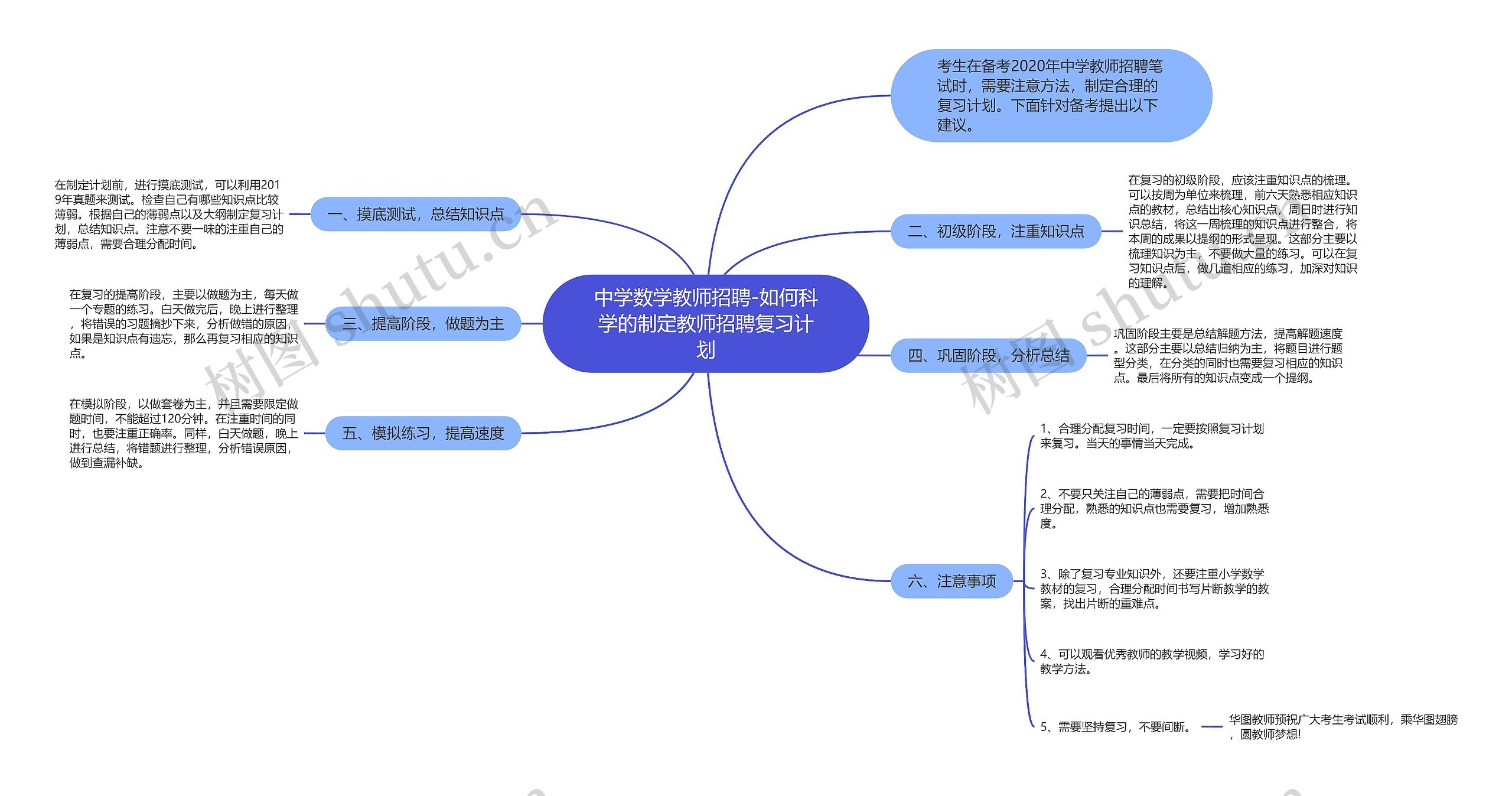 中学数学教师招聘-如何科学的制定教师招聘复习计划思维导图,备考2020年中学教师招聘笔试时,需要注意方法,制定合理的复习计划,建议首先进行摸底测试,总结知识点,注意合理分配时间,在初级阶段,应注重知识点的梳理,按周为单位进行总结。提高阶段,以做题为主,分析做错的原因,巩固阶段是总结解题方法,提高解题速度,在模拟阶段,以做套卷为主,需要限定做题时间,同时应注意合理分配复习时间、复习知识点的熟悉度、小学数学教材的复习、优秀教师的教学方法学习和坚持复习。