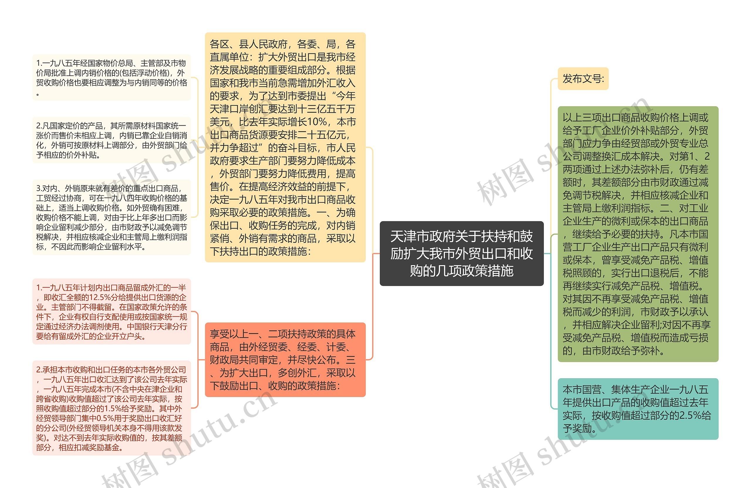 各区、县人民政府,各委、局,各直属单位:扩大外贸出口是我市经济发展战略的重要组成部分。根据国家和我市当前急需增加外汇收入的要求,为了达到市委提出“今年天津口岸创汇要达到十三亿五千万美元,比去年实际增长10%,本市出口商品货源要安排二十五亿元,并力争超过”的奋斗目标,市人民政府要求生产部门要努力降低成本,外贸部门要努力降低费用,提高售价。在提高经济效益的前提下,决定一九八五年对我市出口商品收购采取必要的政策措施。一、为确保出口、收购任务的完成,对内销紧俏、外销有需求的商品,采取以下扶持出口的政策措施: