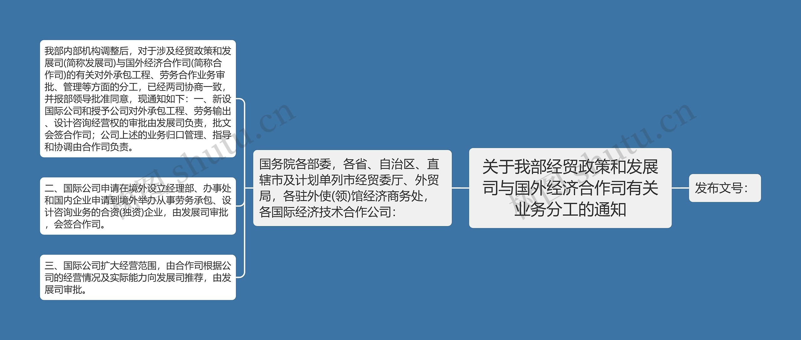 树图思维导图提供《关于我部经贸政策和发展司与国外经济合作司有关业务分工的通知》在线思维导图免费制作,点击“编辑”按钮,可对《关于我部经贸政策和发展司与国外经济合作司有关业务分工的通知》进行在线思维导图编辑,本思维导图属于思维导图模板主题,文件编号是:b6e0d2a6a1a4625c692c77131668fe76