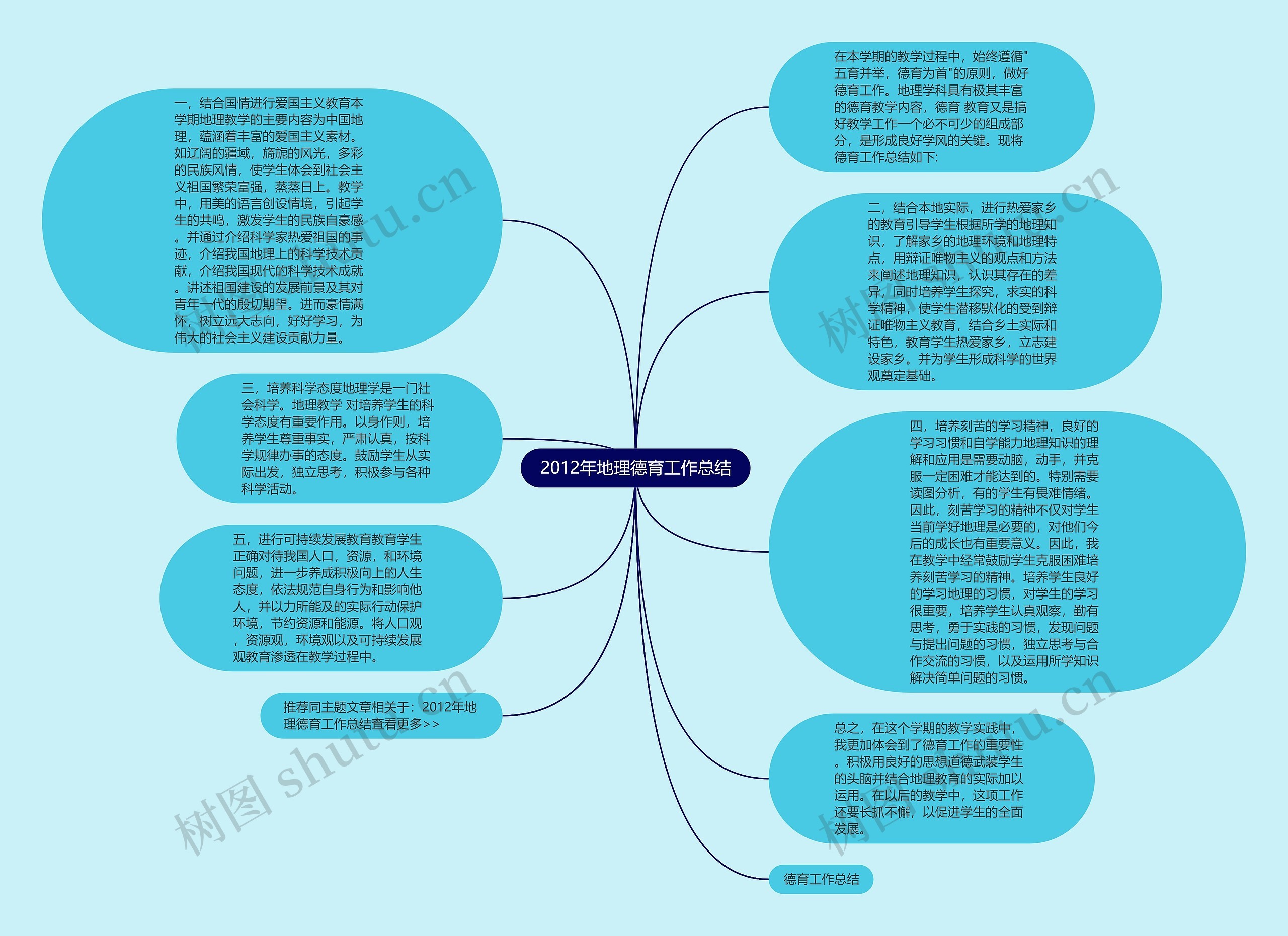在本学期的教学过程中,始终遵循"五育并举,德育为首"的原则,做好德育工作。地理学科具有极其丰富的德育教学内容,德育 教育又是搞好教学工作一个必不可少的组成部分,是形成良好学风的关键。现将德育工作总结如下: