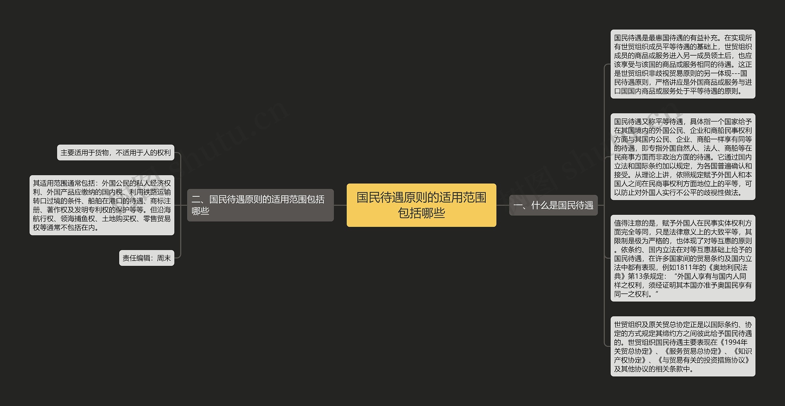 世贸组织及原关贸总协定正是以国际条约、协定的方式规定其缔约方之间彼此给予国民待遇的。世贸组织国民待遇主要表现在《1994年关贸总协定》、《服务贸易总协定》、《知识产权协定》、《与贸易有关的投资措施协议》及其他协议的相关条款中。
