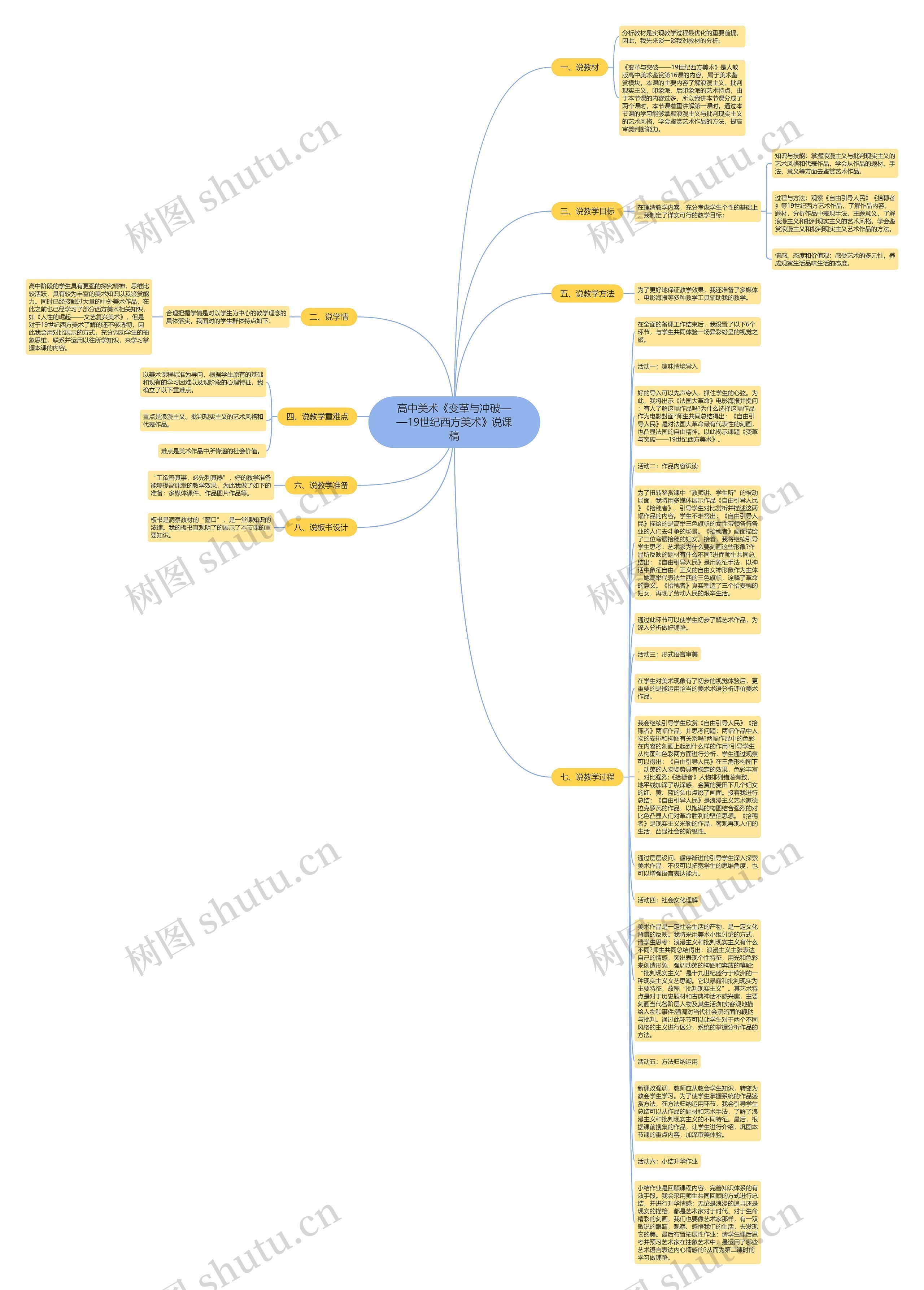 小结作业是回顾课程内容,完善知识体系的有效手段。我会采用师生共同回顾的方式进行总结,并进行升华情感:无论是浪漫的追寻还是现实的描绘,都是艺术家对于时代、对于生命精彩的刻画,我们也要像艺术家那样,有一双敏锐的眼睛,观察、感悟我们的生活,去发现它的美。最后布置拓展性作业:请学生课后思考并预习艺术家在抽象艺术中,是运用了哪些艺术语言表达内心情感的?从而为第二课时的学习做铺垫。