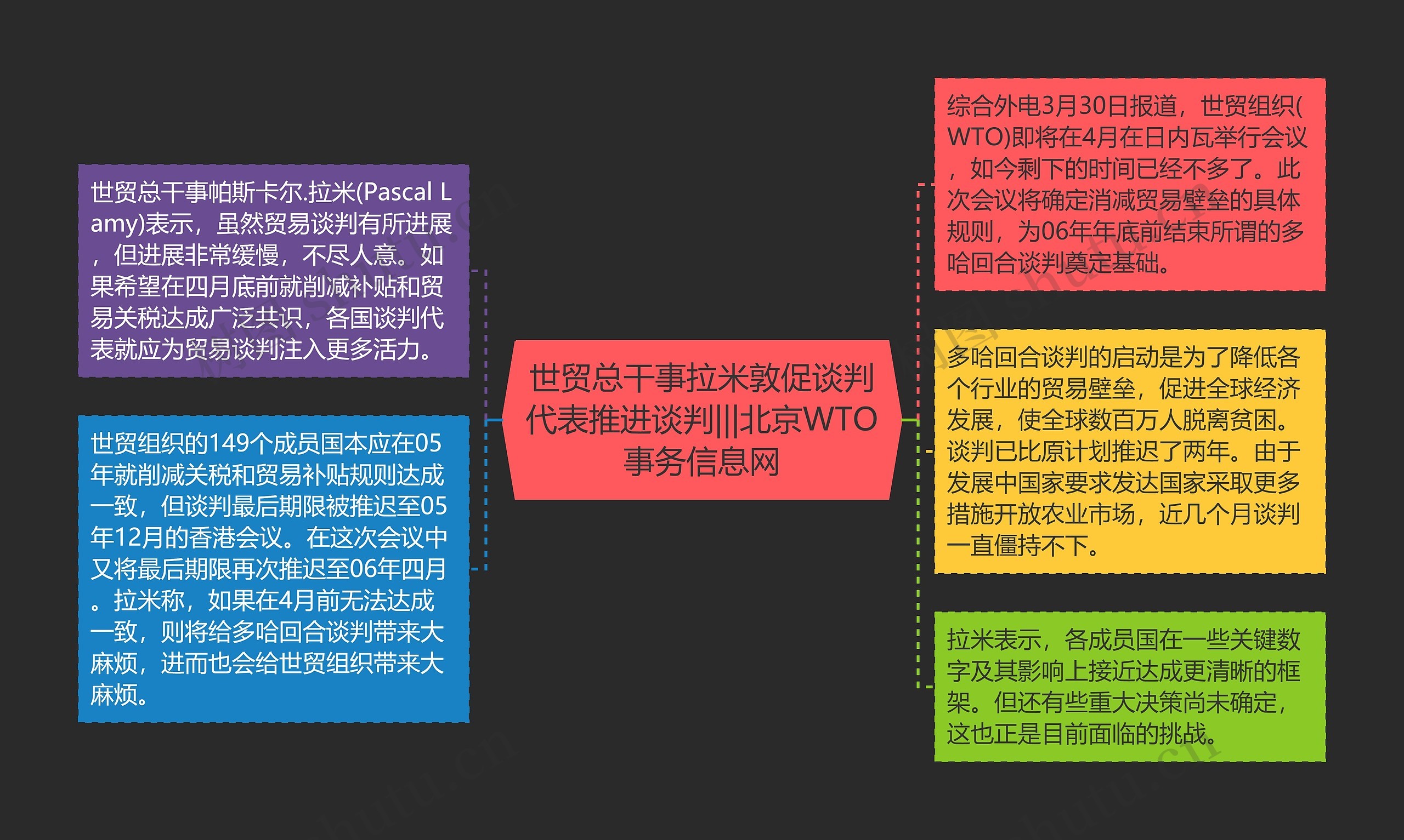世贸组织的149个成员国本应在05年就削减关税和贸易补贴规则达成一致,但谈判最后期限被推迟至05年12月的香港会议。在这次会议中又将最后期限再次推迟至06年四月。拉米称,如果在4月前无法达成一致,则将给多哈回合谈判带来大麻烦,进而也会给世贸组织带来大麻烦。