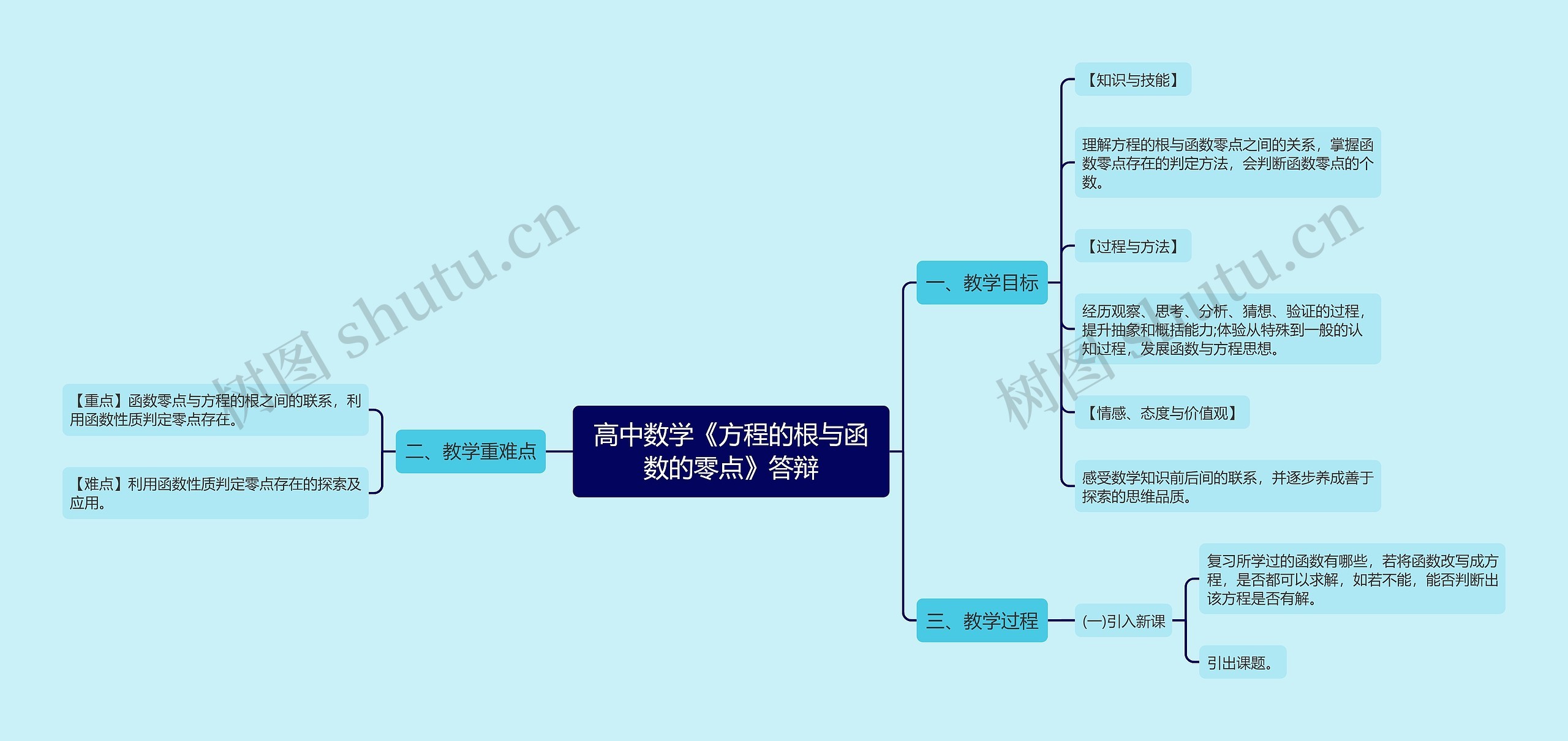 高中数学《方程的根与函数的零点》答辩思维导图重点介绍了如何理解方程的根与函数零点之间的关系和掌握函数零点存在的判定方法,同时说明了通过观察、思考、分析、猜想和验证过程来提高学生的抽象和概括能力,并发展函数与方程思想,培养学生善于探索的思维品质。教学重点是函数零点与方程的根之间的联系,利用函数性质判定零点存在,难点是如何探索及应用函数性质判定零点存在,教学过程包含复习已学过的函数、引入课题。