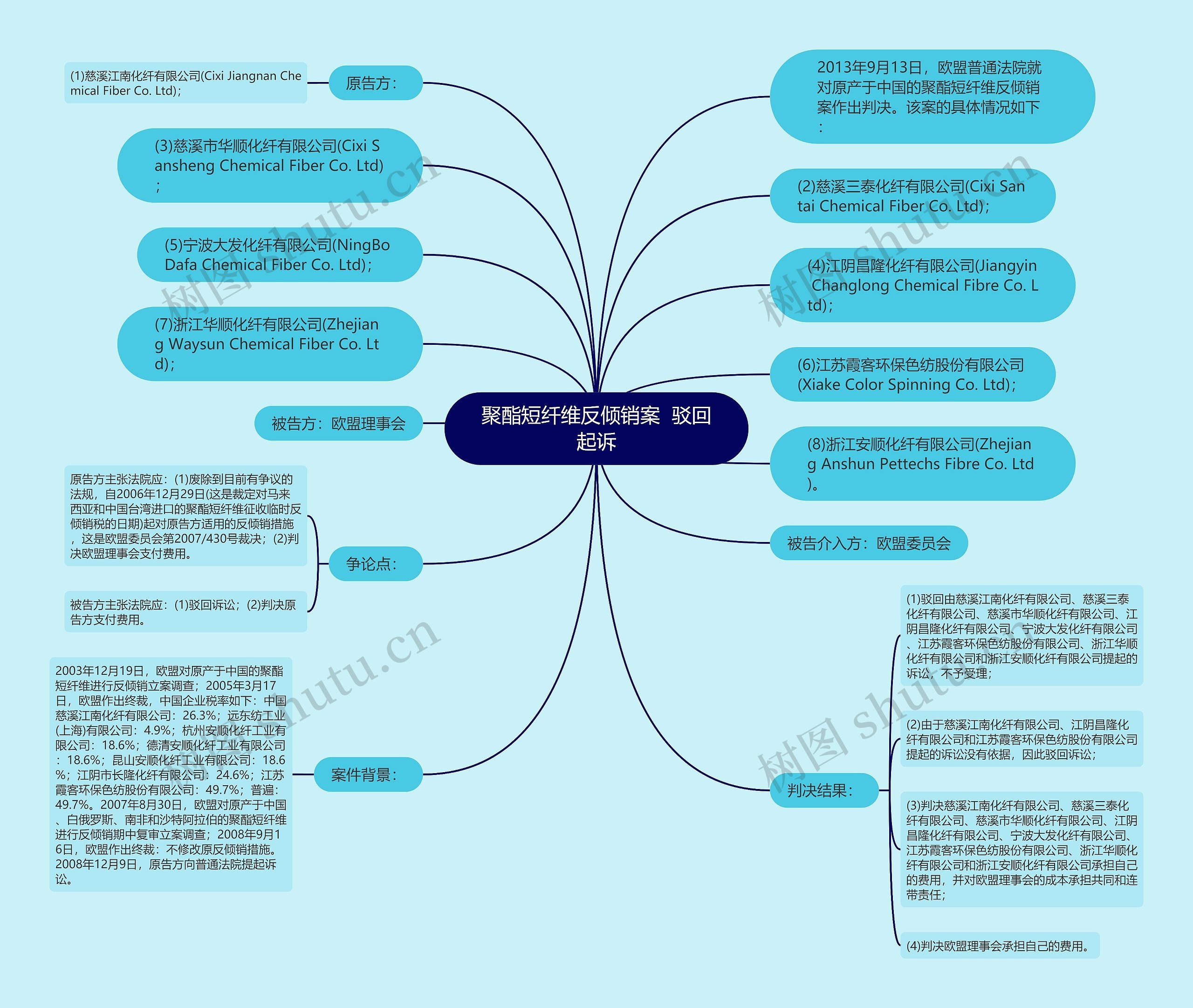 2003年12月19日,欧盟对原产于中国的聚酯短纤维进行反倾销立案调查;2005年3月17日,欧盟作出终裁,中国企业税率如下:中国慈溪江南化纤有限公司:26.3%;远东纺工业(上海)有限公司:4.9%;杭州安顺化纤工业有限公司:18.6%;德清安顺化纤工业有限公司:18.6%;昆山安顺化纤工业有限公司:18.6%;江阴市长隆化纤有限公司:24.6%;江苏霞客环保色纺股份有限公司:49.7%;普遍:49.7%。2007年8月30日,欧盟对原产于中国、白俄罗斯、南非和沙特阿拉伯的聚酯短纤维进行反倾销期中复审立案调查;2008年9月16日,欧盟作出终裁:不修改原反倾销措施。2008年12月9日,原告方向普通法院提起诉讼。