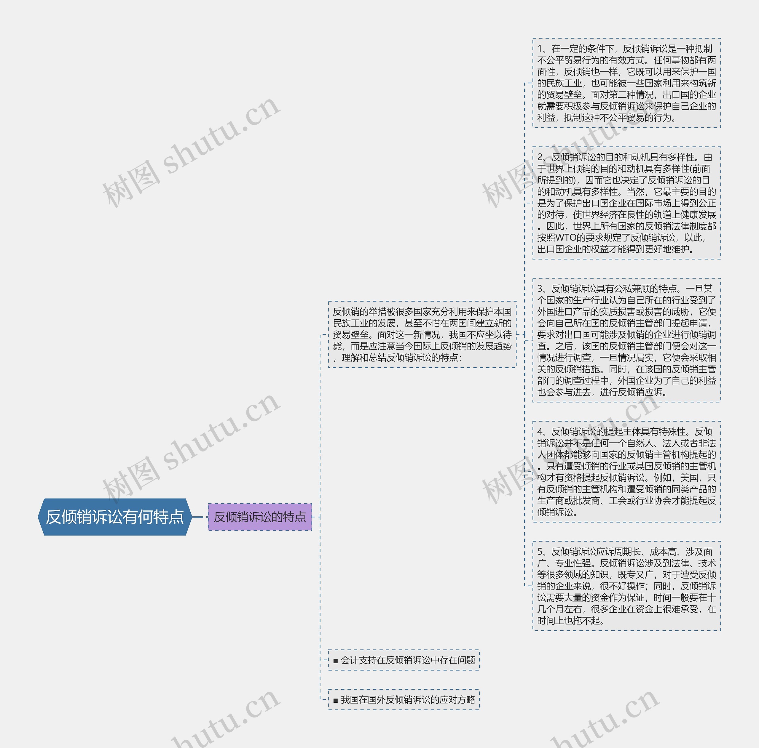 树图思维导图提供《反倾销诉讼有何特点》在线思维导图免费制作,点击“编辑”按钮,可对《反倾销诉讼有何特点》进行在线思维导图编辑,本思维导图属于思维导图模板主题,文件编号是:347c4c1f9b4424756074ea8c814f20d2