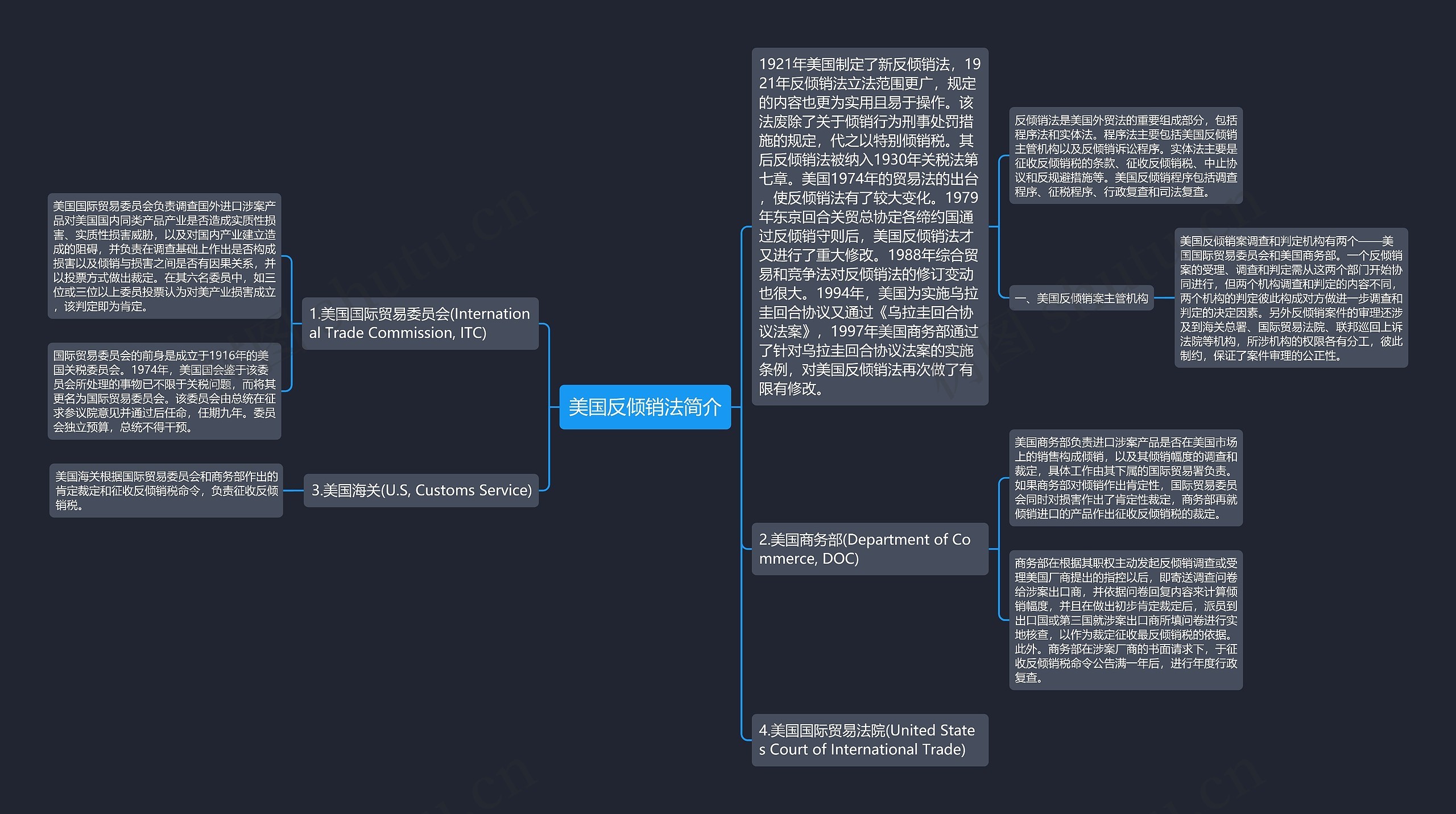 反倾销法是美国外贸法的重要组成部分,包括程序法和实体法。程序法主要包括美国反倾销主管机构以及反倾销诉讼程序。实体法主要是征收反倾销税的条款、征收反倾销税、中止协议和反规避措施等。美国反倾销程序包括调查程序、征税程序、行政复查和司法复查。