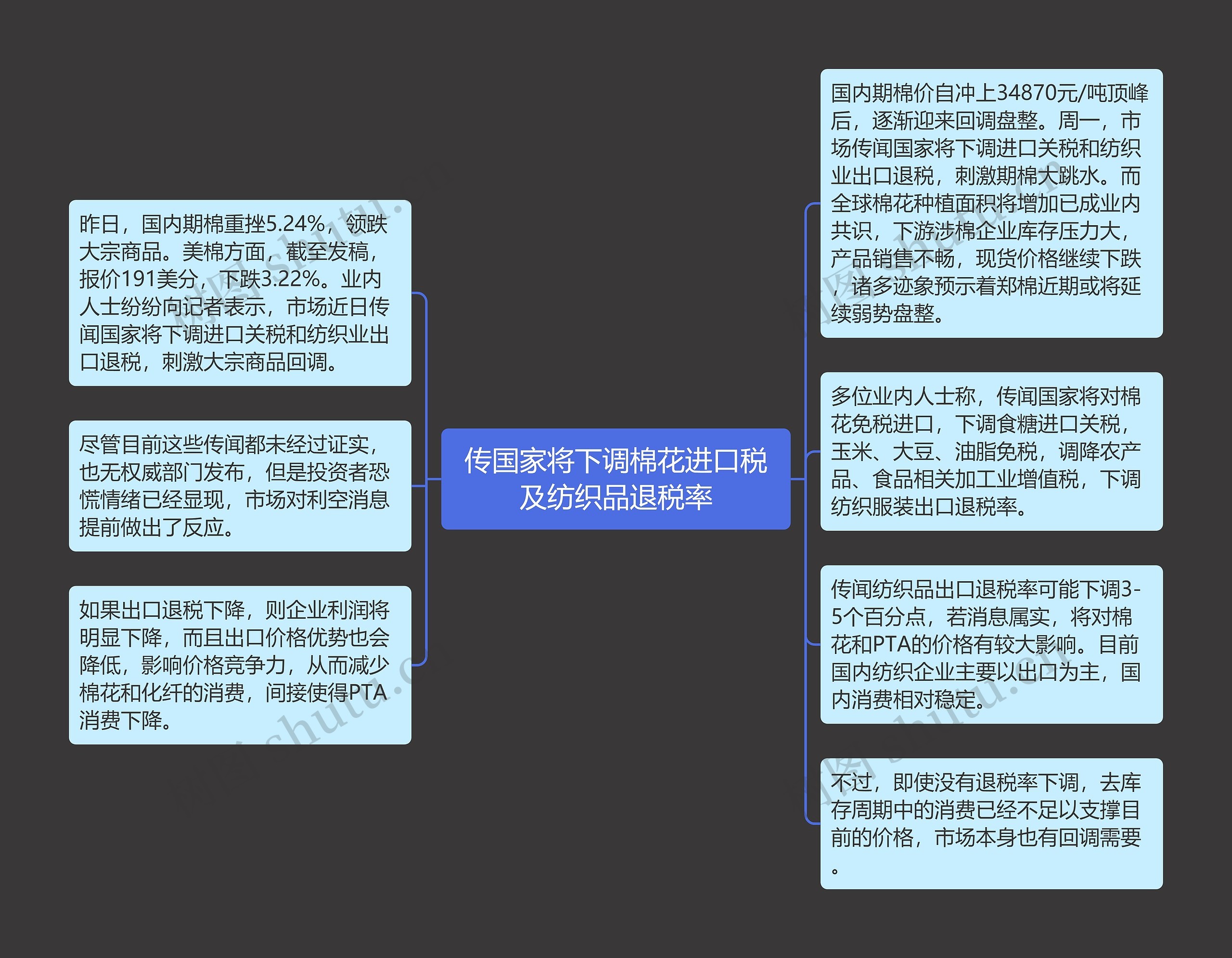 多位业内人士称,传闻国家将对棉花免税进口,下调食糖进口关税,玉米、大豆、油脂免税,调降农产品、食品相关加工业增值税,下调纺织服装出口退税率。