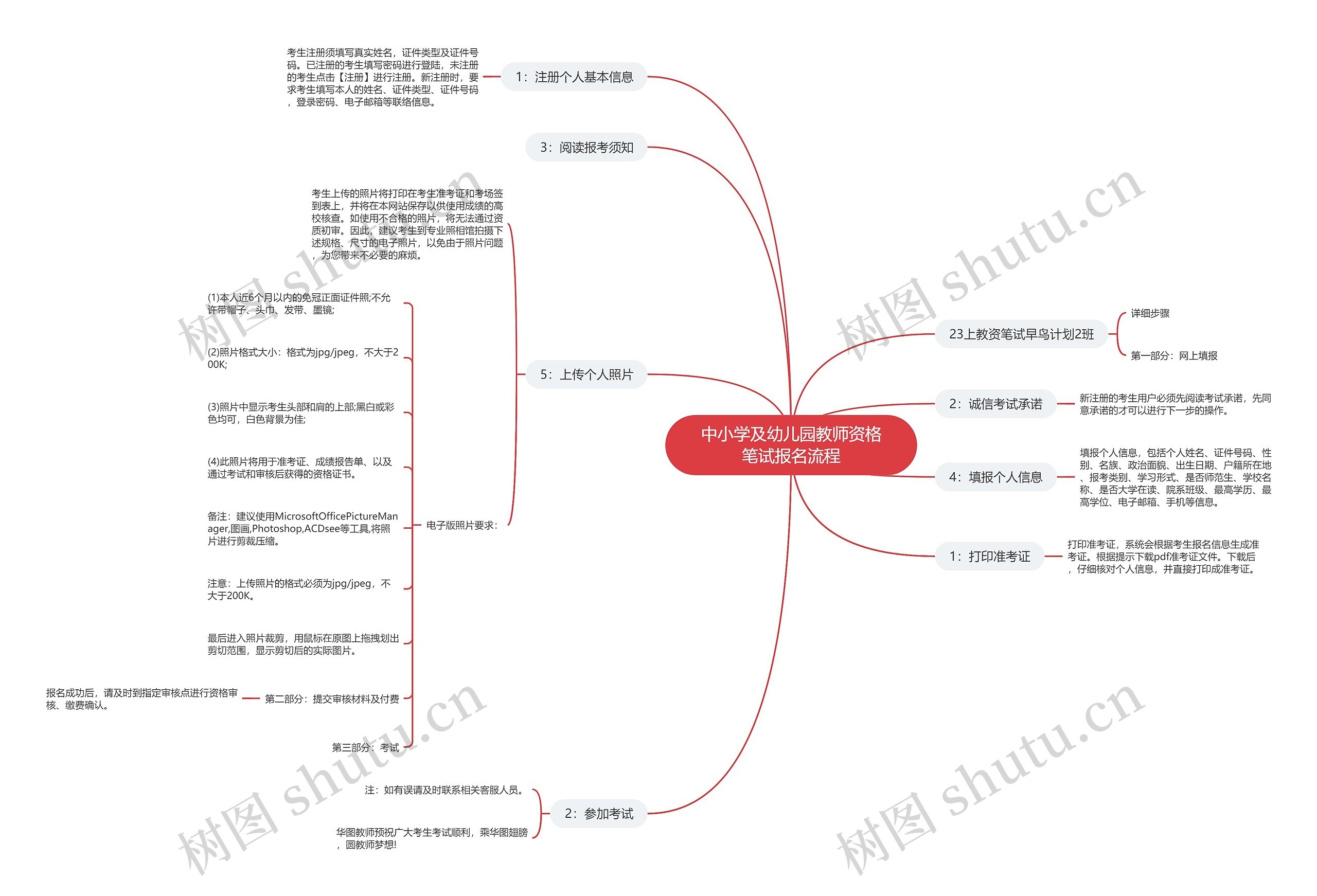 树图思维导图提供《中小学及幼儿园教师资格笔试报名流程》在线思维导图免费制作,点击“编辑”按钮,可对《中小学及幼儿园教师资格笔试报名流程》进行在线思维导图编辑,本思维导图属于思维导图模板主题,文件编号是:1acb8ceecdaf0f75886b7648786697b4
