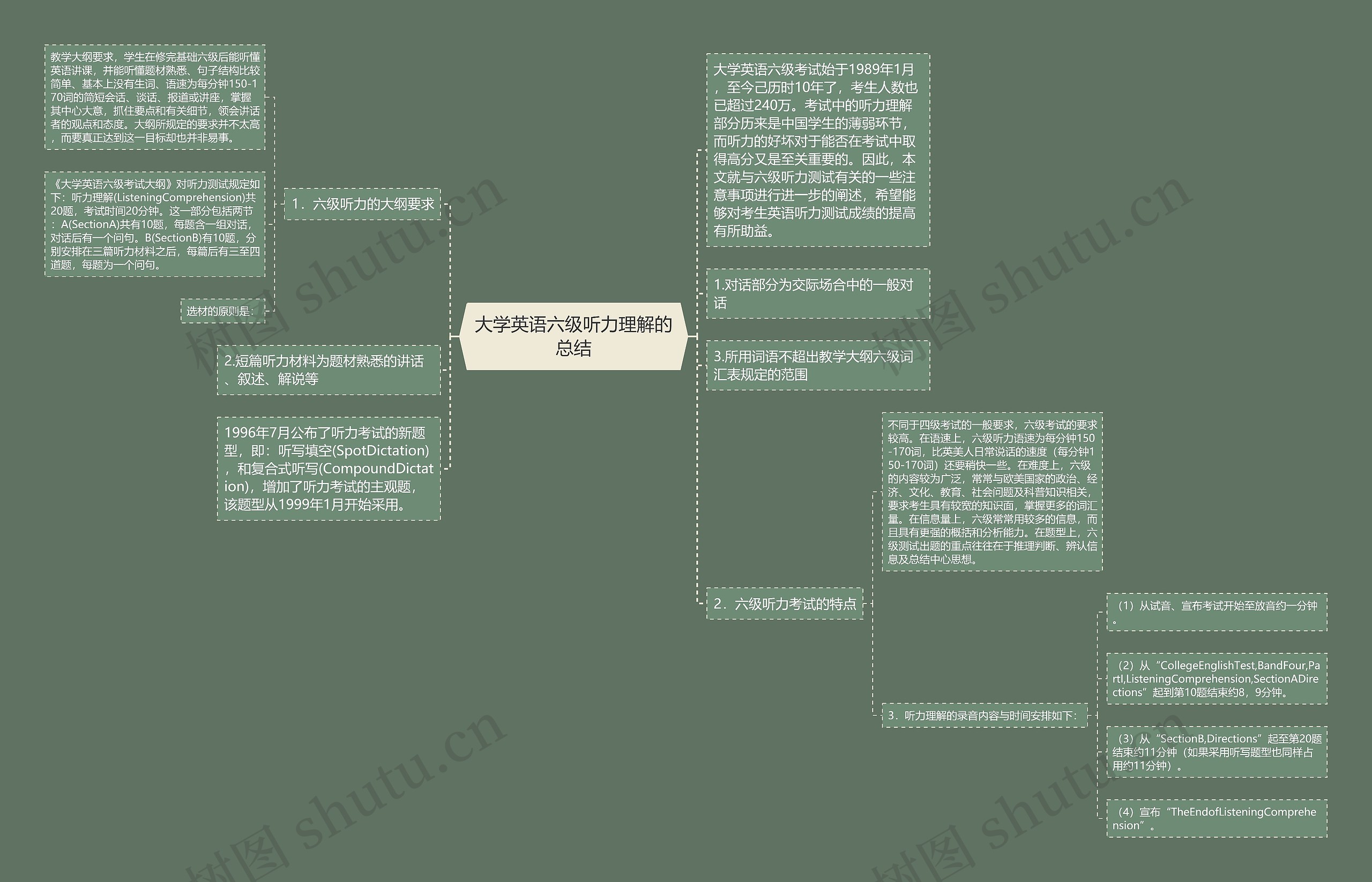 树图思维导图提供《大学英语六级听力理解的总结》在线思维导图免费制作,点击“编辑”按钮,可对《大学英语六级听力理解的总结》进行在线思维导图编辑,本思维导图属于思维导图模板主题,文件编号是:7cdd1921f78833cfd8874384c5e842fc